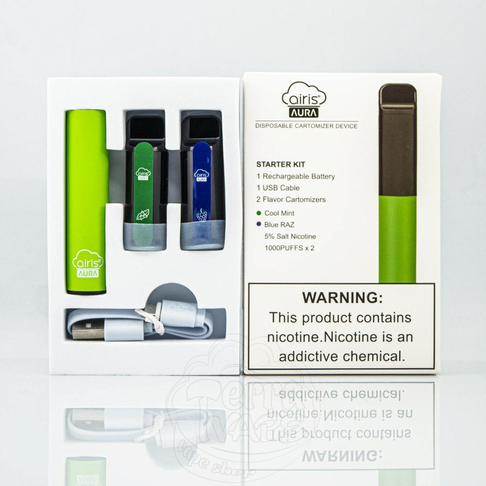 Airis Aura Starter Kit 5% Green (Cool Mint/Blue Razz) - це стартовий набір батарейного блоку зеленого кольору з двома заправленими картриджами: освіжаюча м'ята , синя малина. Девайс працює від вбудованого акумулятора ємністю 550мАч із зарядкою через порт мікро юсб, що знаходиться внизу корпусу. Кожен картридж розрахований на експлуатацію до тисячі тяг. Пристрій ідеально підійде новачкам у сфері вейпінгу, оскільки автоматично активується і не потребує настроювання.