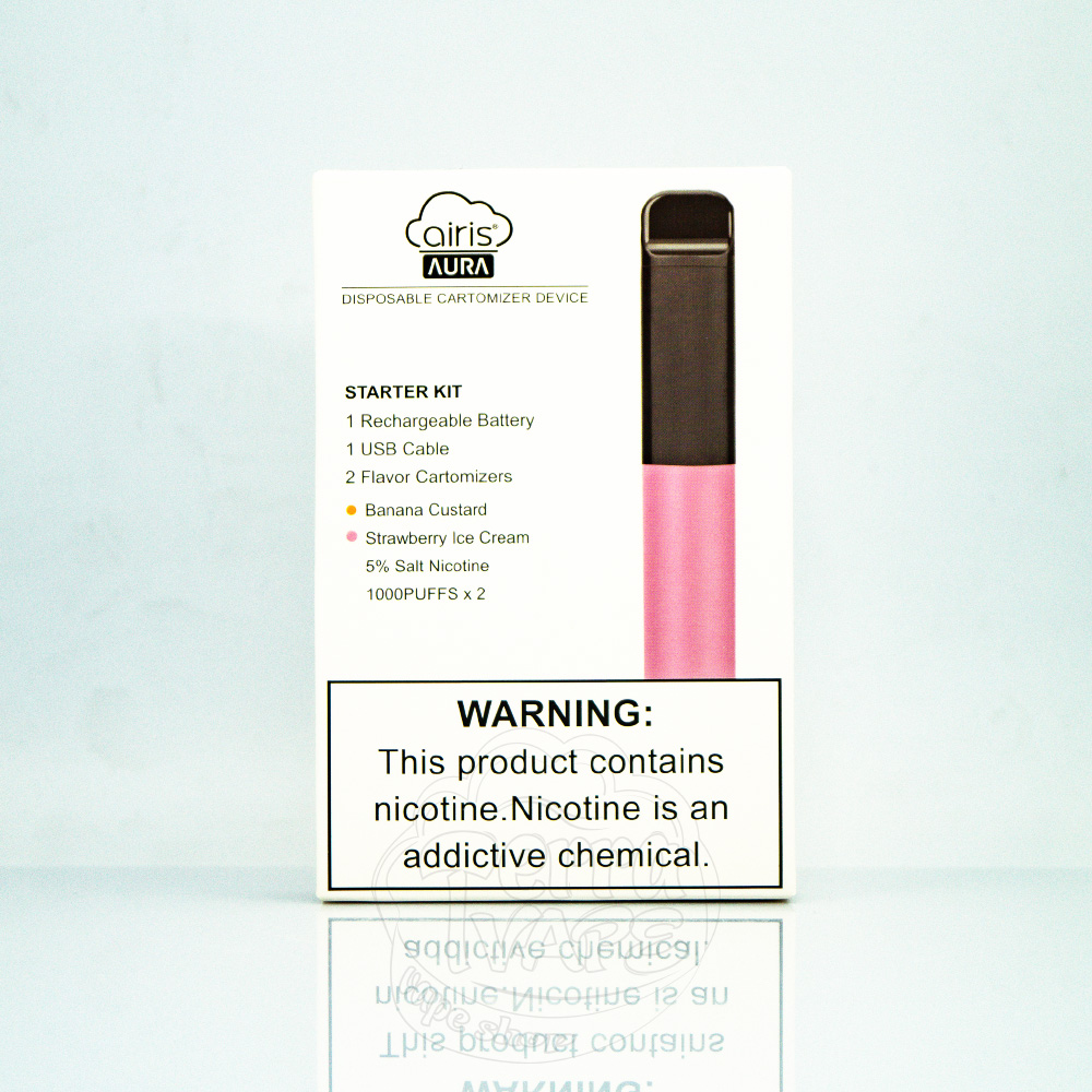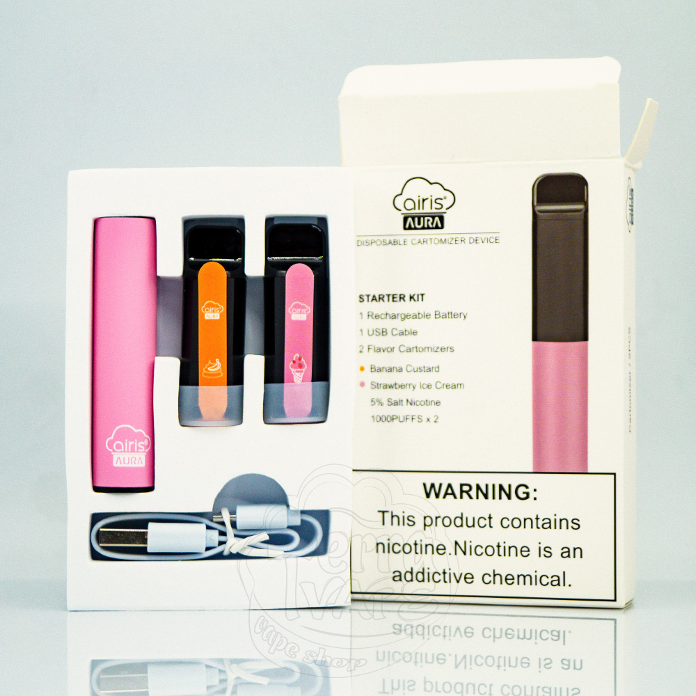 Airis Aura Starter Kit 5% Pink (Banana Custard/Strawberry Ice Cream) - це стартовий набір батарейного блоку рожевого кольору з двома заправленими картриджами: банановий крем, полуничне морозиво. Девайс працює від вбудованого акумулятора ємністю 550мАч із зарядкою через порт мікро юсб, що знаходиться внизу корпусу. Кожен картридж розрахований на експлуатацію до тисячі тяг. Пристрій ідеально підійде новачкам у сфері вейпінгу, оскільки автоматично активується і не потребує настроювання.