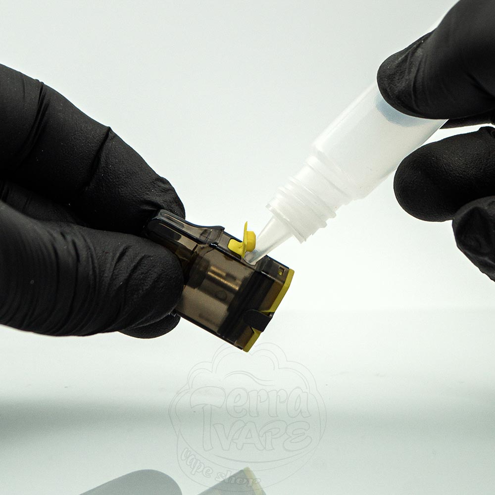 У AirPops Pro Pods передбачена бічна заправка. Щоб заправити картридж, потрібно витягнути жовту гумову заглушку і залити рідину в отвір. Після повернути заглушку на місце і почекати 10-20 хвилин, щоб вата у випарнику просочилася жижею.