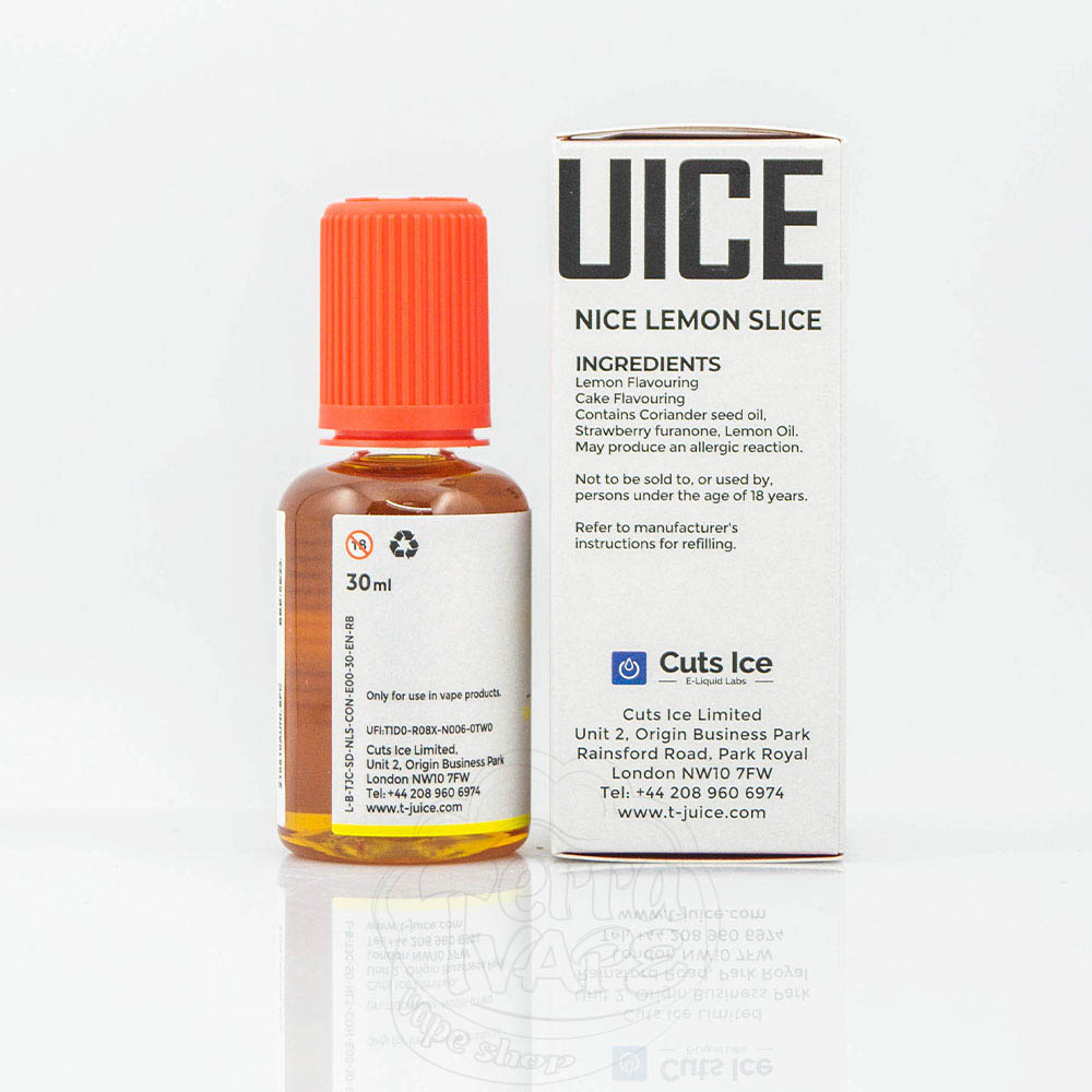 Ароматизатор T-Juice Nice Lemon Slice 30ml - це солодка та пікантна десертна суміш, яка копіює смачний лимонний пиріг. На вдиху масляниста випічка нашаровується на пікантний лимонний сир, а на видиху - солодкий, цитрусовий аромат.