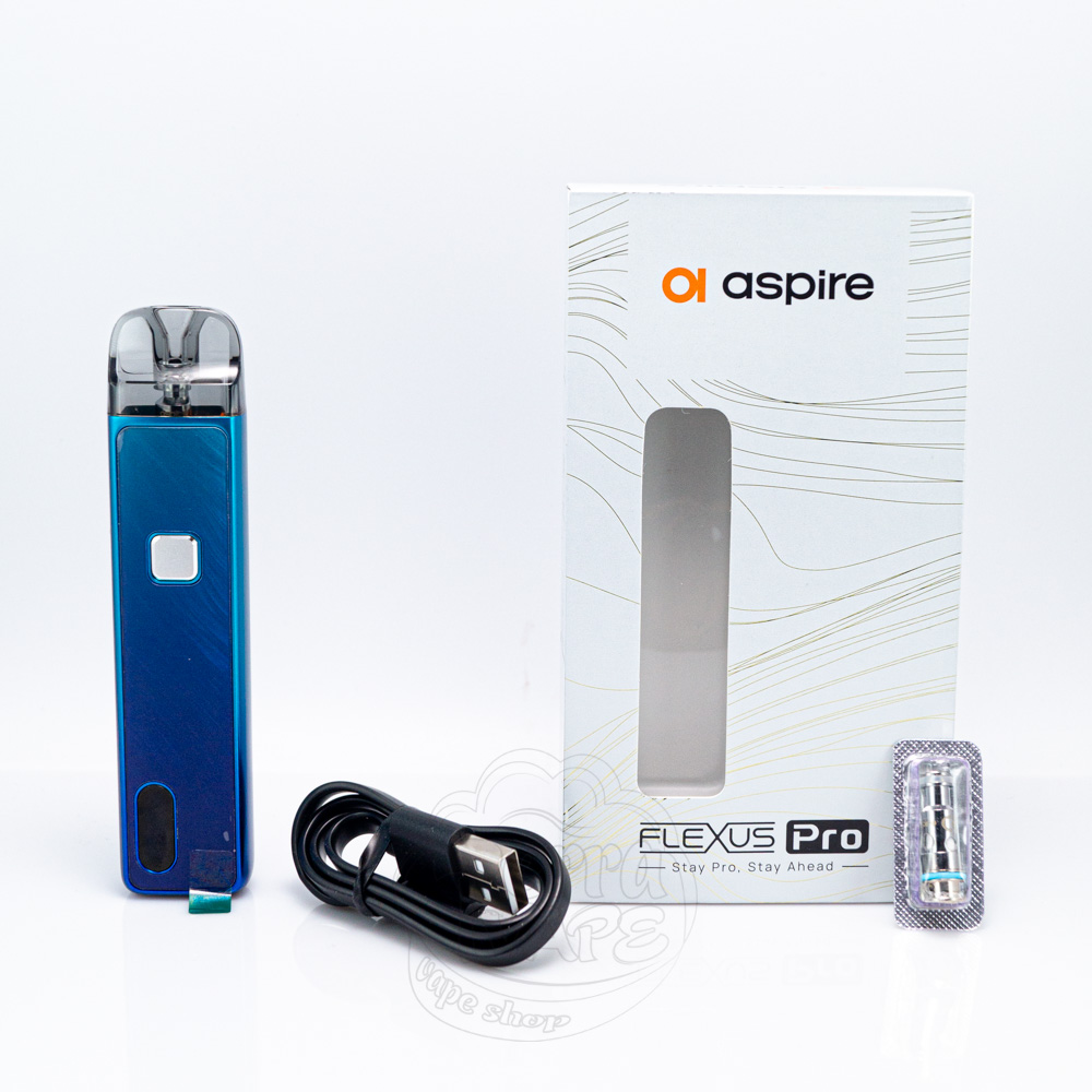 Aspire Flexus Pro Pod Kit 1200mAh - це багаторазова под-система від компанії Aspire. Вона працює від вбудованої батареї, ємність якої складає 1200мАг. Потужність пристрою може досягати позначки 30W. На корпусі є крихітний 0.54-дюймовий дисплей, який допоможе вам орієнтуватися у налаштуваннях. Електронна сигарета може активуватися як від кнопки, так і автоматично, а також ви зможете перемикатися між трьома режимами. Є регулятор затяжки, щоб корегувати паріння під свої вподобання. Комплектний картридж працює в парі з випарниками AF Coil, а об'єм резервуару складає 3мл. Пристрій заряджається через роз'єм Туре-С зі струмом швидкістю 2А.