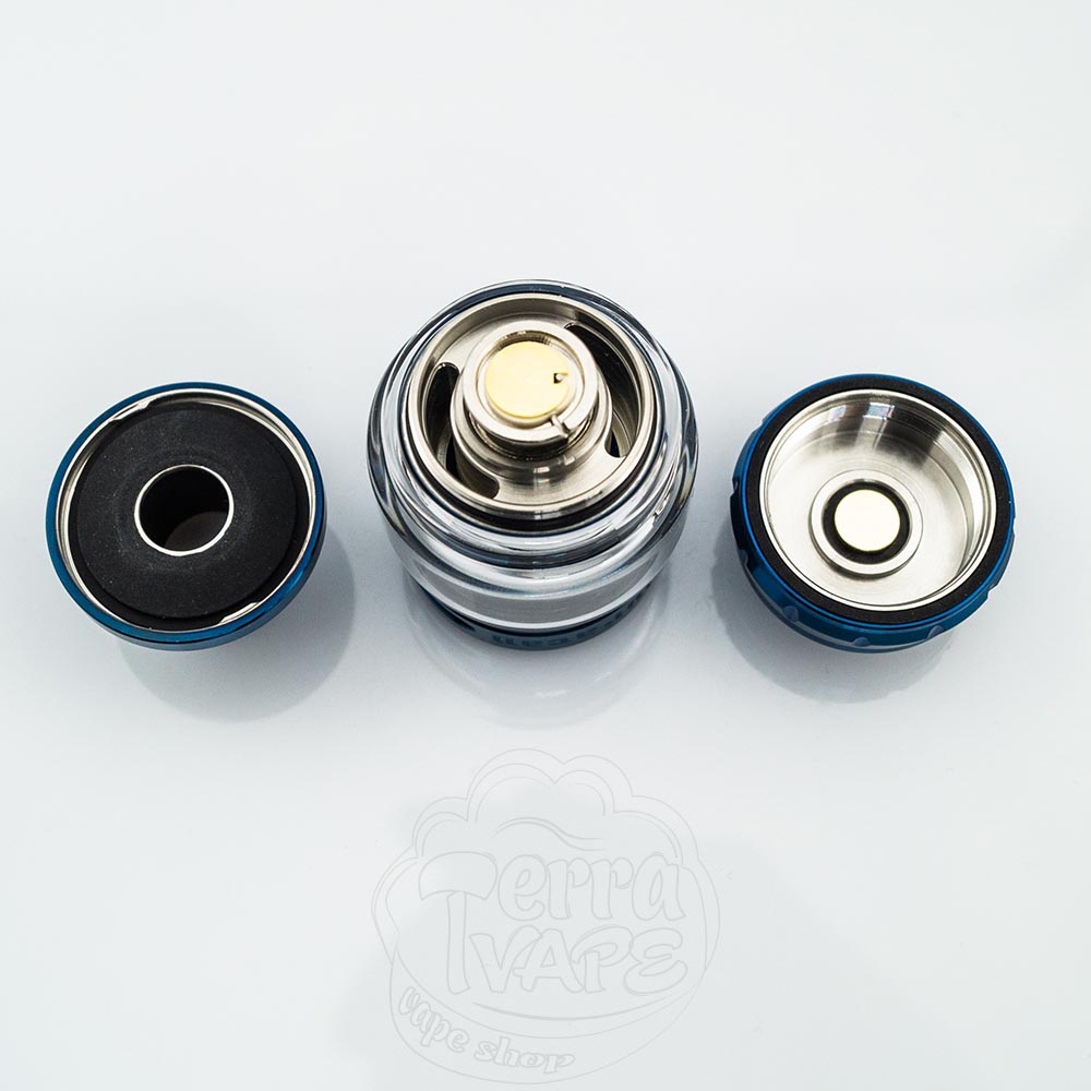 Угорі розташувався змінний 810 дріп-тип. Відразу під ним знаходиться кришка, відкрутивши в чверть оберту, яку ви отримуєте доступ до заправного отвору. Кільце регулювання обдува також у верхній частині бака, що позитивно позначається на відсутності протікання. На куполі розташувався вигравіруваний логотип моделі.