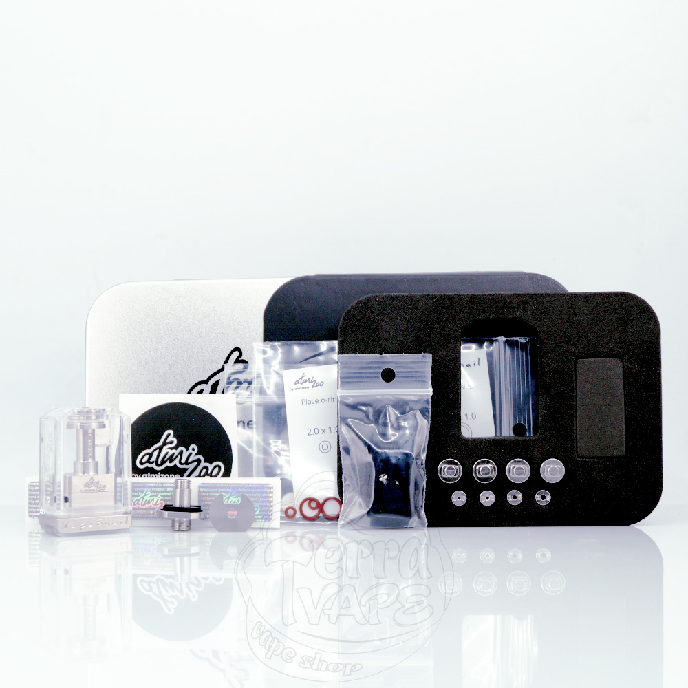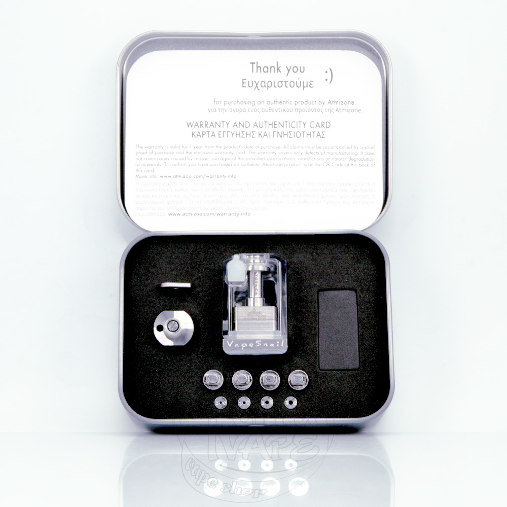 Atmizoo VapeSnail RBA (Boro) - це преміальний обслуговуваний атомайзер для AIO-пристроїв, в яких використовується Boro-з'єднання, виробництва грецької компанії Atmizoo. Резервуар виконаний з PCTG (матеріал стійкий до рідин, склад яких тріскає звичайний пластик) і вміщує до 4.5 мл рідини для електронних сигарет. Велика зручна база для установки спіралей і перехідник на 510 з'єднання, для пропалювання койлів.