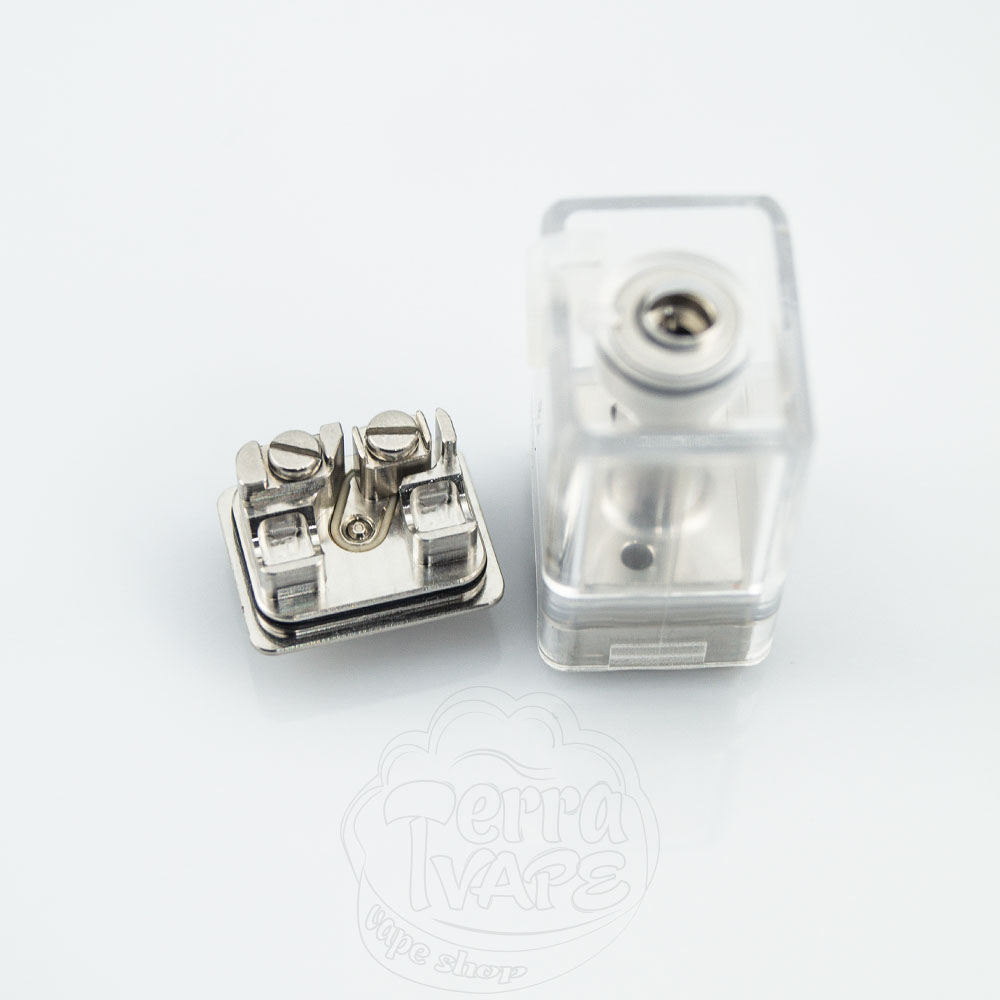 Квадратная база имеет две стойки, расположенные на одной плоскости, удобные пазы для укладки ваты, а также огромное количество места для установки даже достаточно жирных билдов.