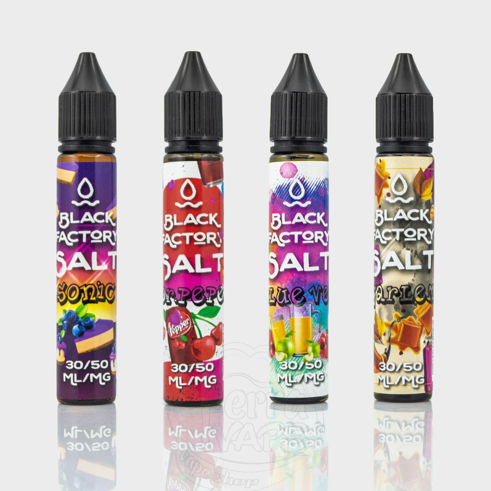 Black Factory Salt - це жижа на сольовому нікотині в об'ємі 30мл від українського виробника Black Factory. Пропілен гліколь співвідноситься до гліцерину як 50/50, що є ідеальною густотою для просочення картриджів і випарників для під-систем. Міцність може бути в двох варіантах: 25мг/мл і 50мг/мл.