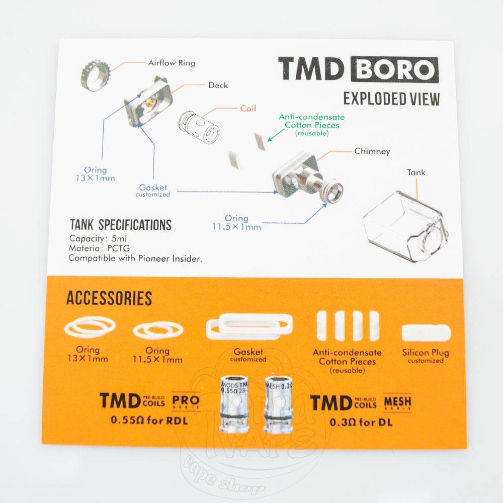 Бак має звичайну білу гумову заглушку, яку потрібно підняти знизу, щоб заправити. На передній частині нанесено назву TMD Boro, а внизу можна побачити регулятор обдування, який забезпечує досить великий обдув під час використання койлів з меншим опором для отримання хорошого RDL. Залежно від використовуваної спіралі доступний повітряний потік змінюється.