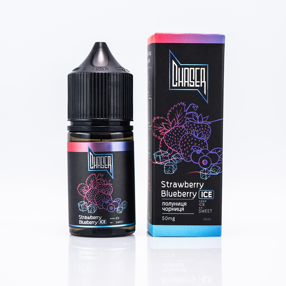 Chaser Black New ICE Salt Strawberry Blueberry ICE30ml 30mg - це сольова рідина для вейпу зі смаком стиглої полуниці та чорниці з ефектом прохолоди.