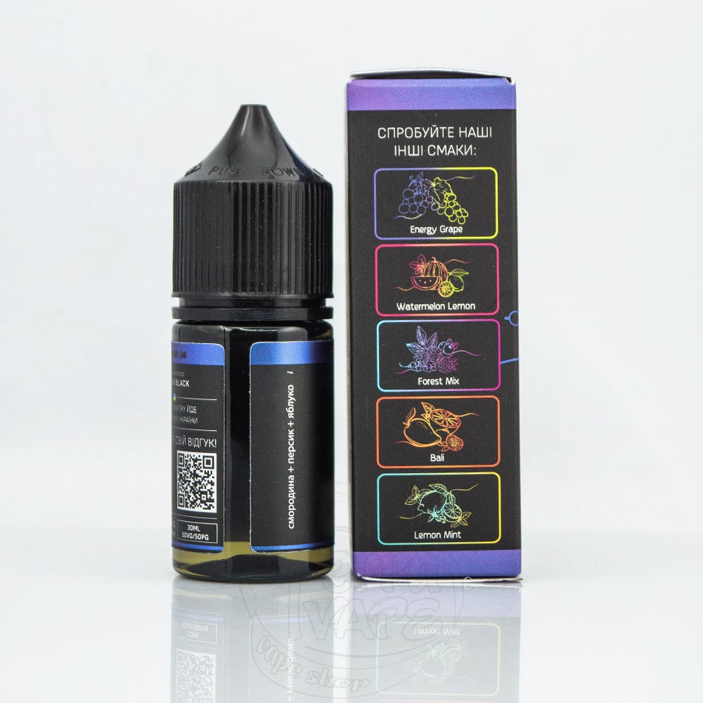 Chaser Black Salt New Blackcurrant Peach Apple 30ml 30mg- жидкость для электронных сигарет на солевом никотине со вкусом классического сочетания яблока и персика удивит вас ноткой черной смородины на выдохе.