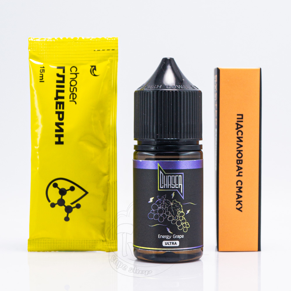 Chaser Black Ultra Salt Energy Grape 30ml 65mg - сольова рідина для електронних сигарет з кислуватим смаком енергетика, який органічно доповнений ягодами червоного винограду.