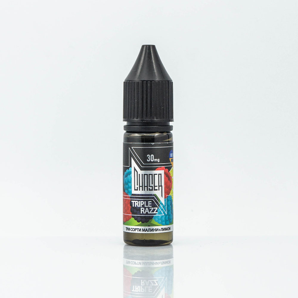 Chaser Black Salt Triple Razz 15ml 50mg - рідина для електронних сигарет на сольовому нікотині зі смаком кислого поєднання трьох сортів малини з лимоном.
