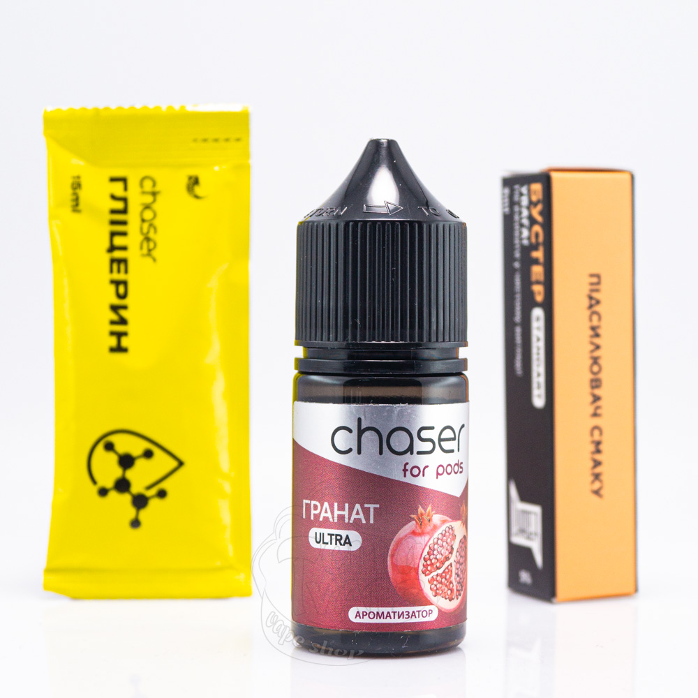 Chaser For Pods Ultra Salt – це набори для самостійного приготування жижі українського виробництва компанії Chaser. Фінальний об'єм після змішування буде складати 30мл. Співвідношення PG/VG – 50/50. Міцність регульована на етапі змішування і може бути будь-якою, залежно від потреби користувача, але виробник пропонує дві опції - 50мг/мл або 65мг/мл.