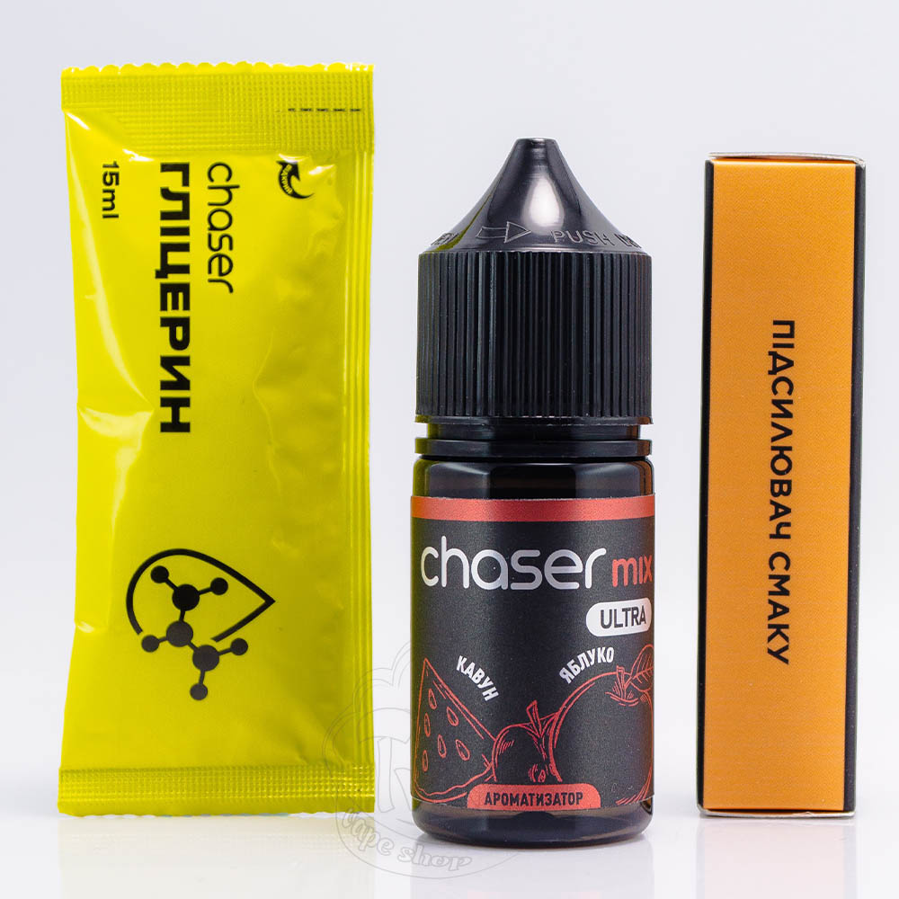Chaser Mix Ultra Salt Кавун Яблуко 30ml 50mg - це набір для самостійного приготування сольової жижки зі смаком неймовірно соковитого кавуна та солодкого яблука, щойно зірваного з дерева.