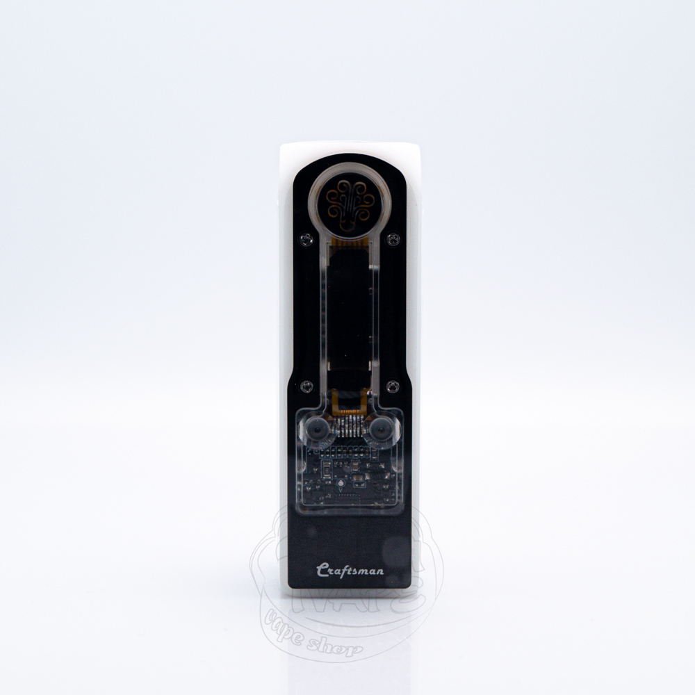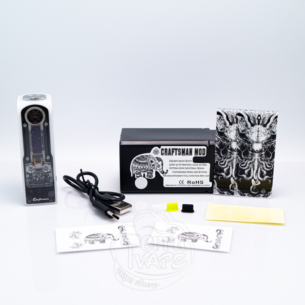 Придбавши Craftsman, ви можете помітити, що як на упаковці, так і на самому пристрої зустрічаються зображення слона. Самі Ктулху говорять, що малюнок слона символізує удачу, силу та процвітання. На лицевій стороні вгорі розмістилася кнопка активації з логотипом компанії. Ця кнопка має підсвітку, яку за бажанням ви можете вимкнути. Нижче, майже не відокремлюючись, є продовгуватий монохромний екран, розмір якого виробником не зазначений. Під ним знаходяться дві маленькі прозорі кнопки навігації, розташовані з обидвох боків. Вони встановлені на прозору панель, під якою чітко видно мікросхему.