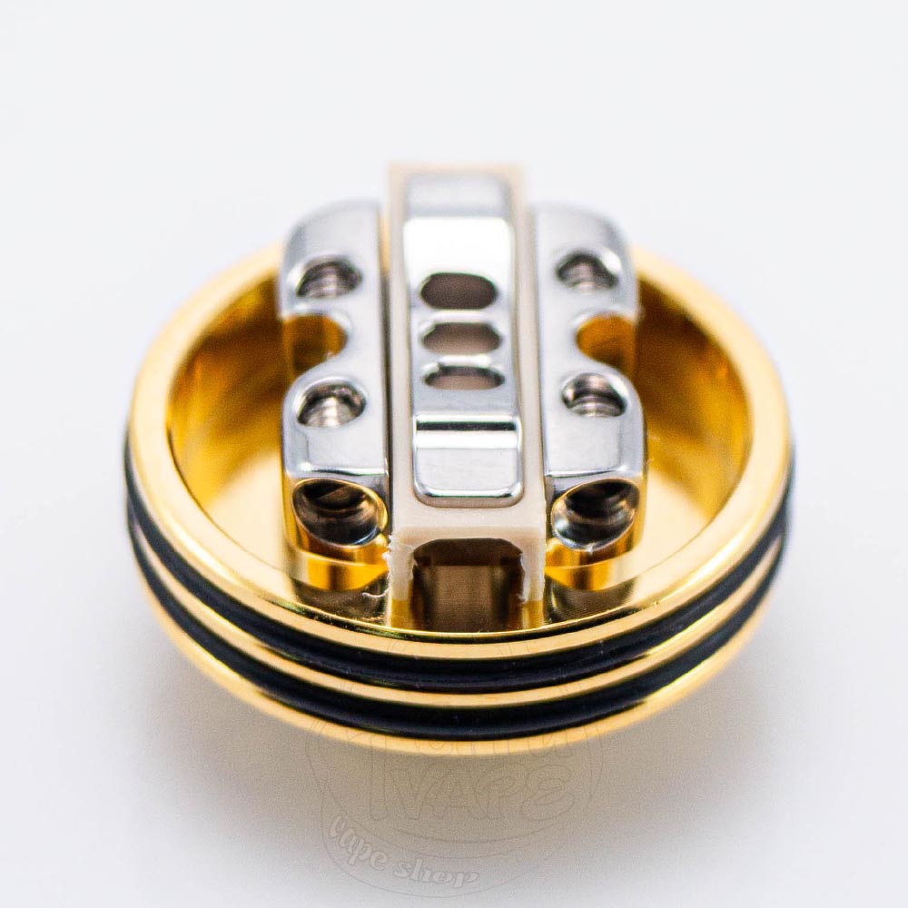 Як ми вже казали, дека dotRDA X може розмістити як одну, так і дві спіралі. На ній немає стійок, тому нагрівальні елементи потрібно буде підрізати перед установкою. Тут є чотири точки з гвинтами, куди і буде інсталюватися спіраль. Між кожною з пар отворів знаходяться заглиблення, які можуть добре вказати напрямок укладки вати. Посередині розташована прямокутна трубка, в яку встановлюються пластини обдуву. Ці вставки можуть мати різну кількість отворів посередині, що і впливатиме на тугість затяжки. Знизу розмістилася достатньо глибока ванночка, яка дозволить утримувати достатній запас рідини.