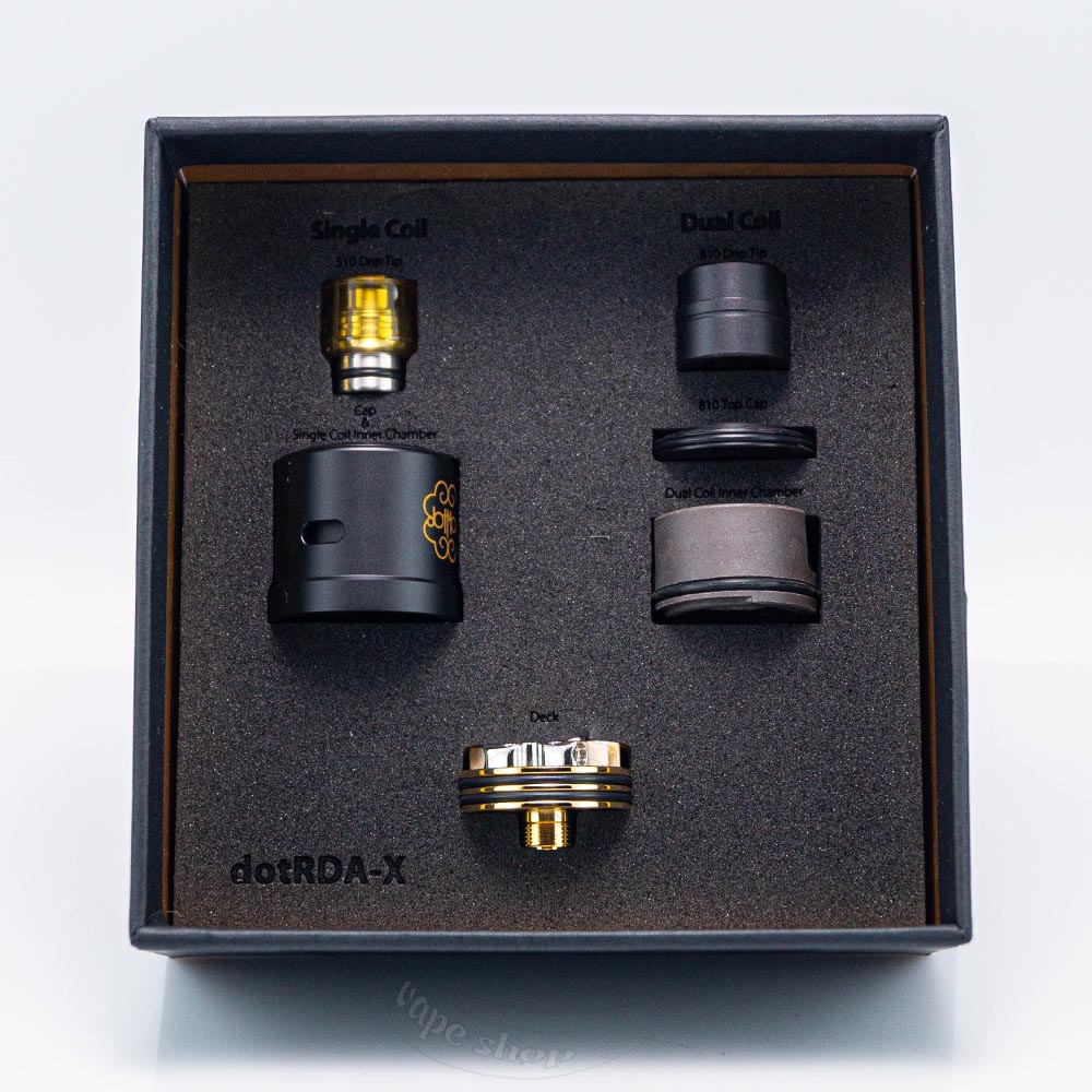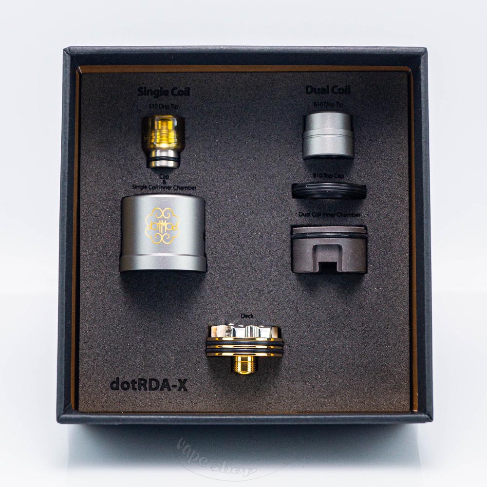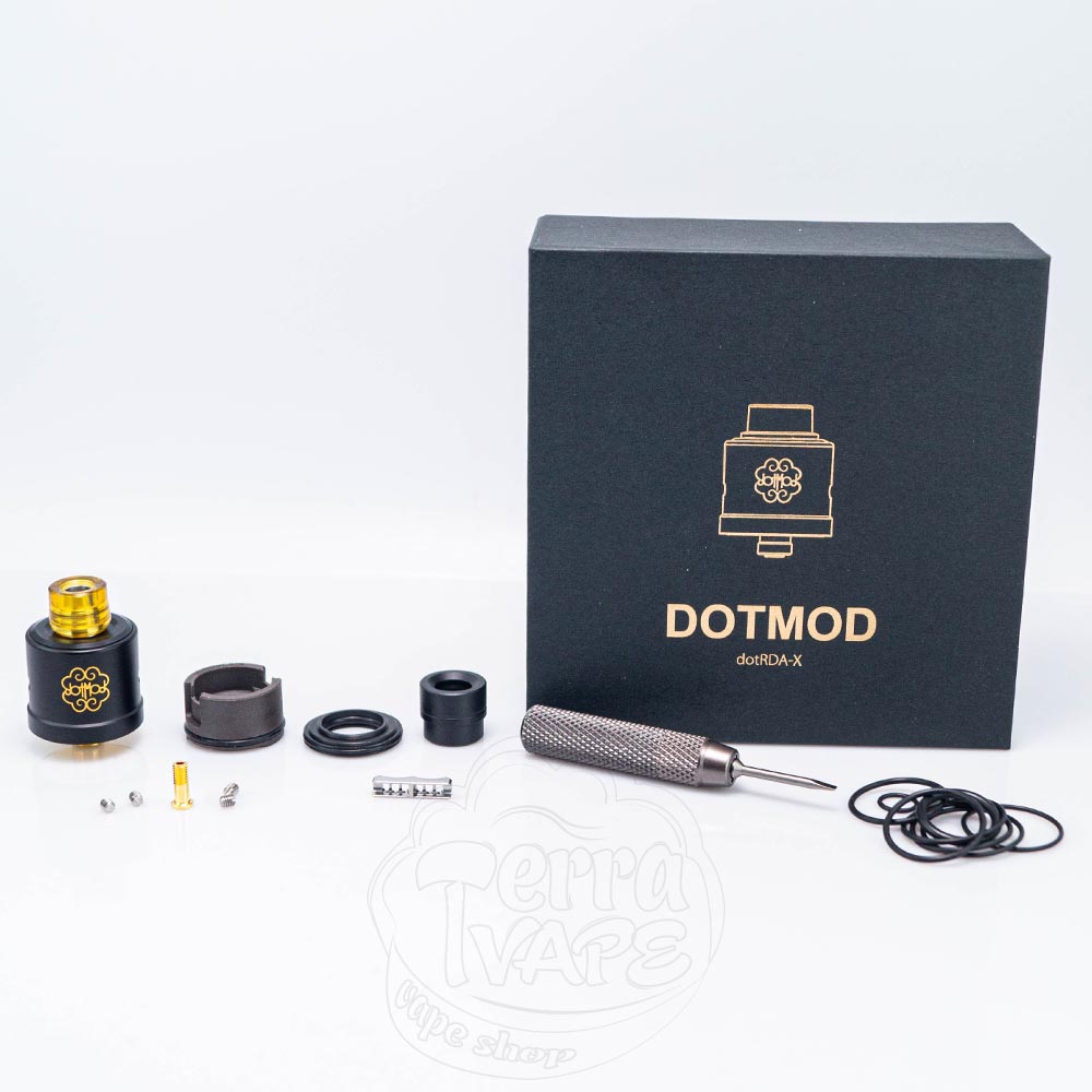 dotMod dotRDA X - це дріпка на одну або дві спіралі від популярної американської компанії dotMod. Вона пропонує широку функціональність використання та забезпечує чіткі налаштування для кожного з видів паріння. Діаметр RDA складає 23мм, тому ви можете використовувати його з більшістю вейпів, які пропонують різні виробники. Для нижнього обдуву є спеціальна вставка, а також він налаштовується звичним кільцем регулювання. Комплектація багата на компоненти, таким чином dotMod максимально подбали про комфорт користувачів та виключили необхідність мати декілька атомайзерів, адже dotRDA X цілком може замінити деякі з них.
