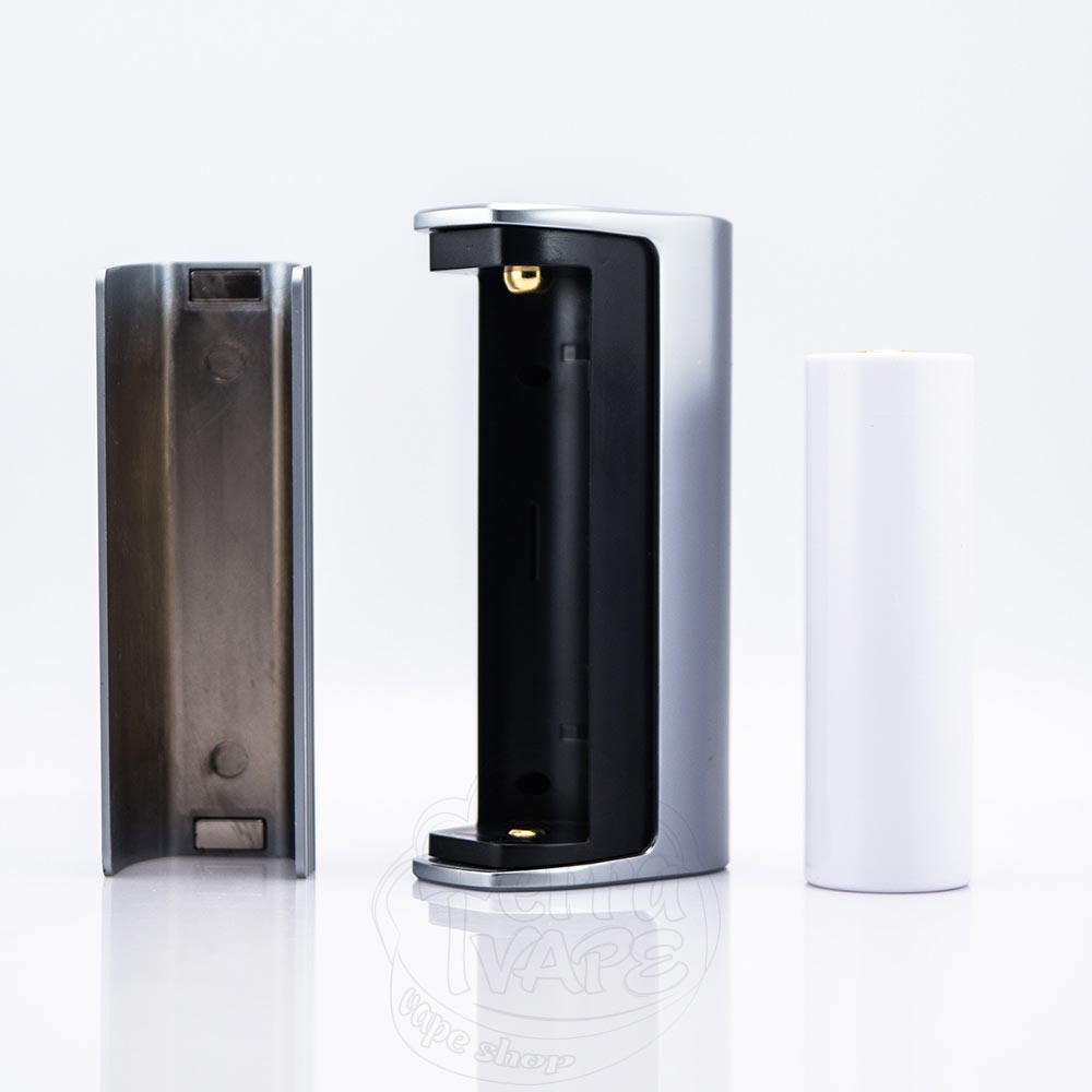 Дверцята батарейного відсіку мають С-подібну конструкцію, що означає від'єднання частини корпусу, яка утримується з обох боків за допомогою найпотужніших магнітів. Посадка досить міцна та під час користування нічого не люфтить. Ви можете використовувати акумулятор формату 21700 або ж 18650. Придбати акумулятор за вигідною ціною з доставкою по всій Україні ви можете в інтернет-магазині TerraVape. Якщо ви віддаєте перевагу батареї 18650, то вам не доведеться додатково шукати адаптер для неї, оскільки виробник подумав про це і поклав його до комплекту, який ви отримаєте.