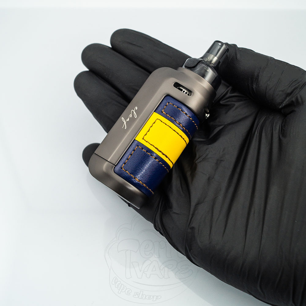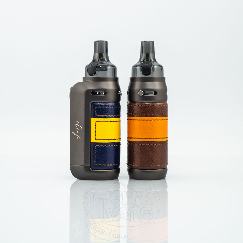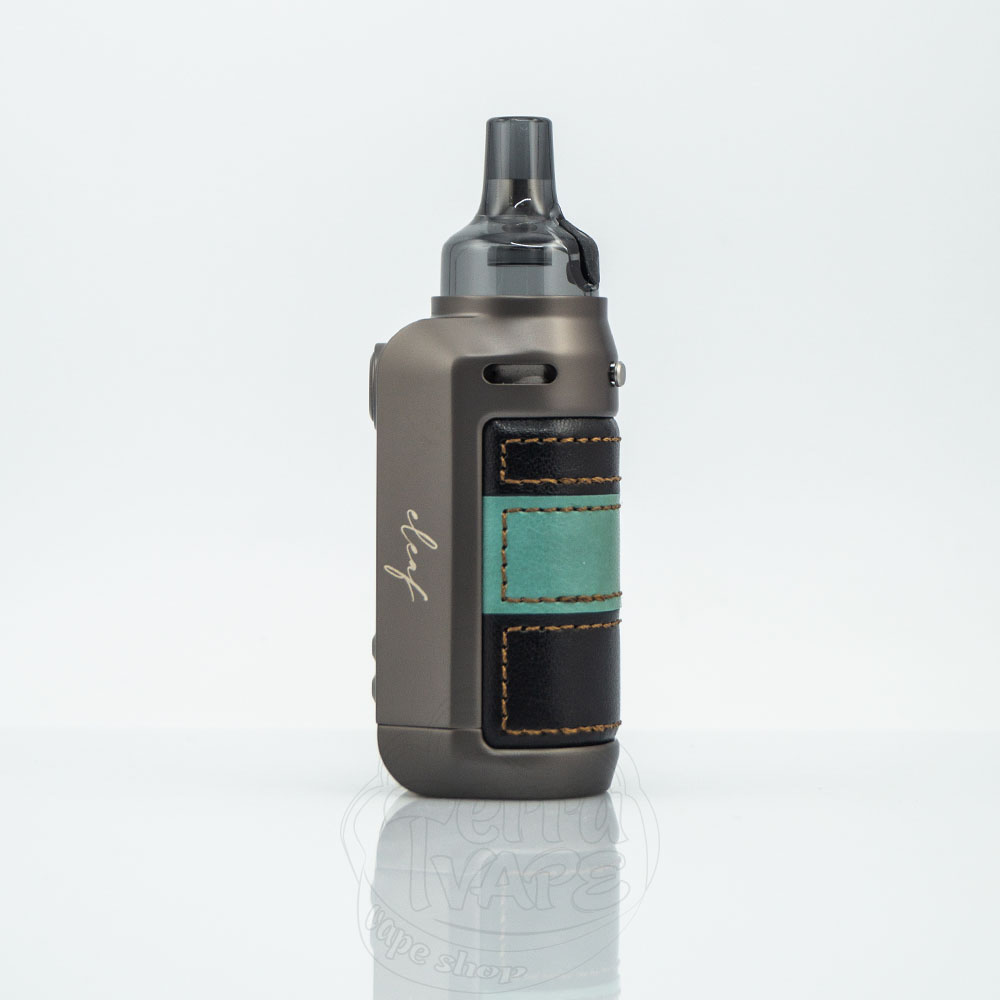 Пристрій виконаний у впізнаваному дизайні Eleaf. Закруглений металевий корпус зі вставками зі штучної шкіри нагадує зменшену версію Voopoo Drag S. Назва компанії та моделі девайсу акуратно вигравірувано курсивом по обидва боки від екрану.