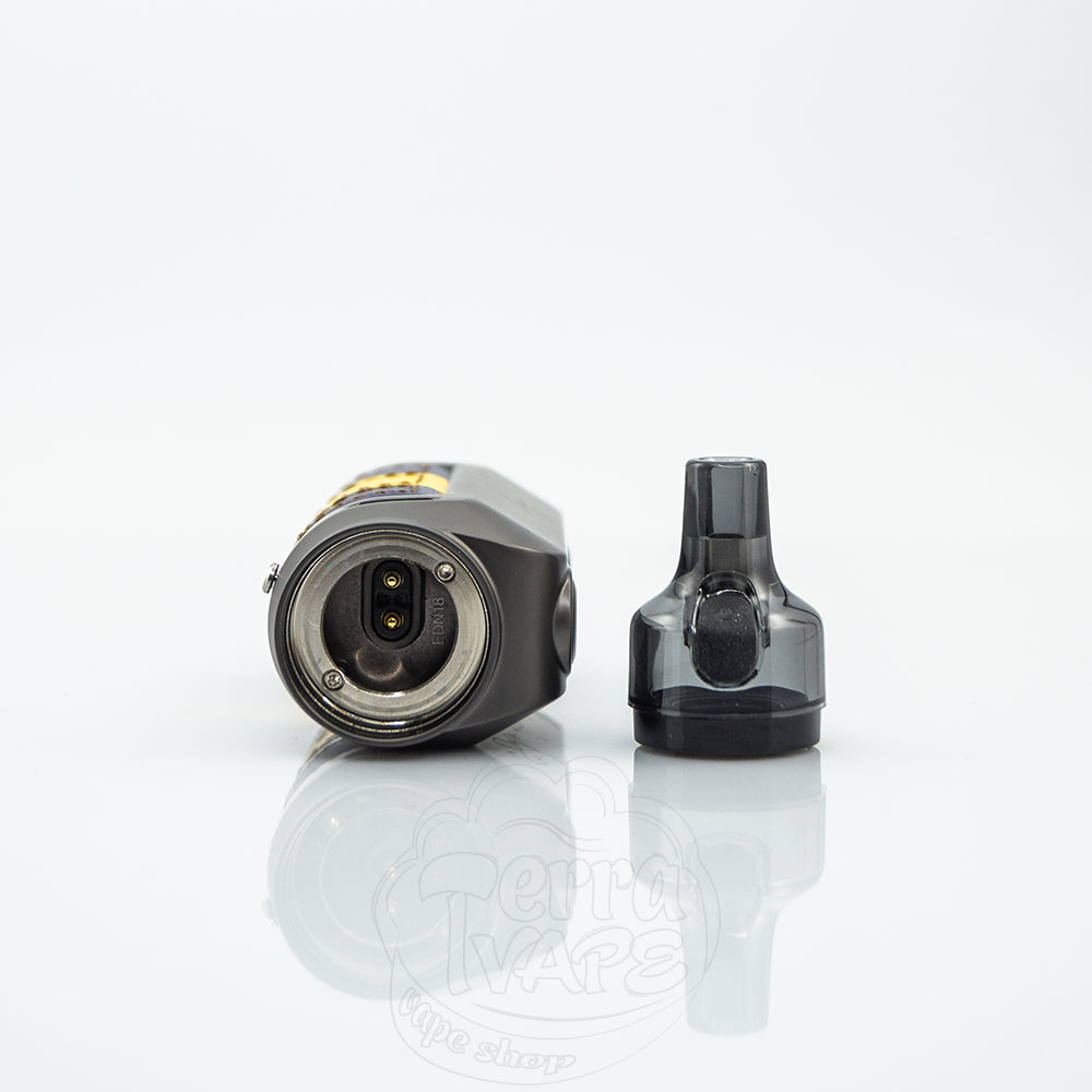 Картридж кріпиться на потужних магнітах. Вміщує до 2 мл рідини для електронних сигарет. Мундштук виконаний у циліндричній формі і плавно витікає з резервуара, тому замінити його, на жаль, не вдасться.