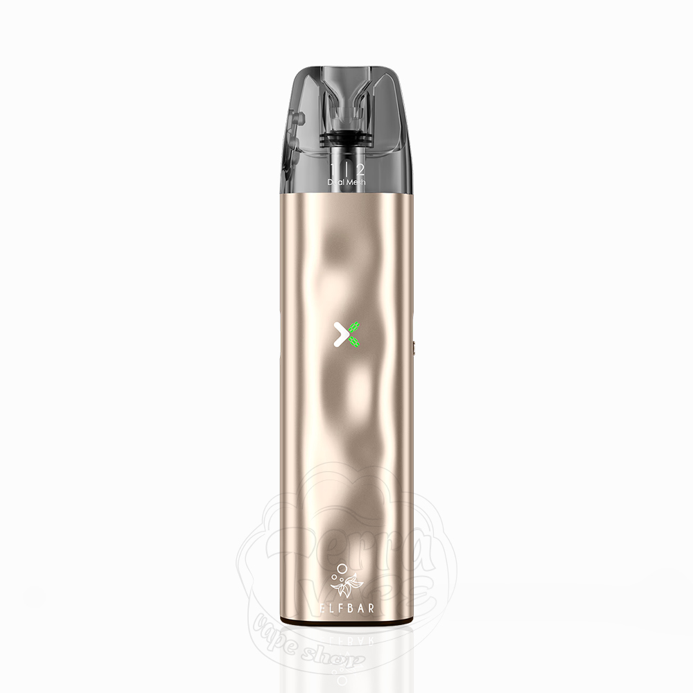 Elf Bar ELFX Mini Pod Kit 1000mAh Gold - це міні версія лінійки багаторазових POD-систем ELFX, золотистого кольору від популярного виробника Elf Bar. В корпусі, який має хвилясту текстуру, вбудований акумулятор ємністю 1000mAh. Максимальна потужність, яку видає електронна сигарета, складає 30W. Пристрій сумісний з усіма картриджами лінійки ELFX, а комплектується з тим, що має нагрівальний елемент опором 0.8Ом, об'єм 3мл, а також верхню заправку. Активація у девайса автоматична, через затяжку, так як на корпусі зовсім немає ні кнопок, ні дисплею, а лише регулятор тугості затяжки, порт Type-C та світловий індикатор заряду.