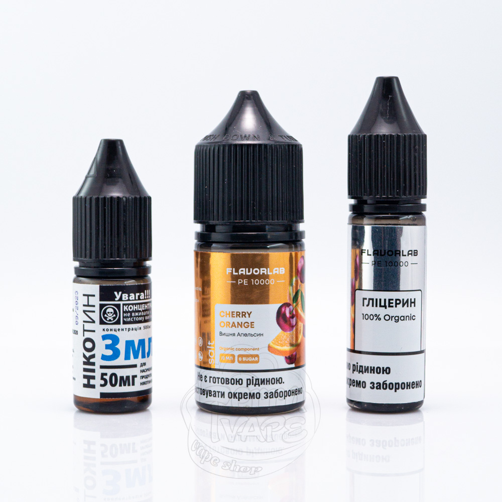 FlavorLab PE 10000 Salt Cherry Orange 30ml 50mg - це набір для самостійного приготування сольової рідини зі смаком вишні та апельсина.