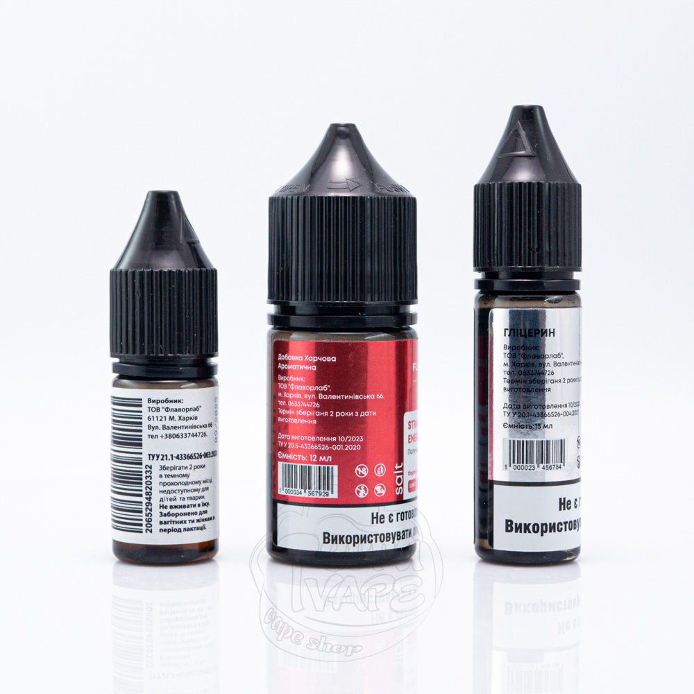 Набір ретельно продуманий і підготовлений для отримання ідеальної рідини для pod-систем. Підсумковий об'єм після змішування становить 30мл. Співвідношення VG/PG - 50/50.