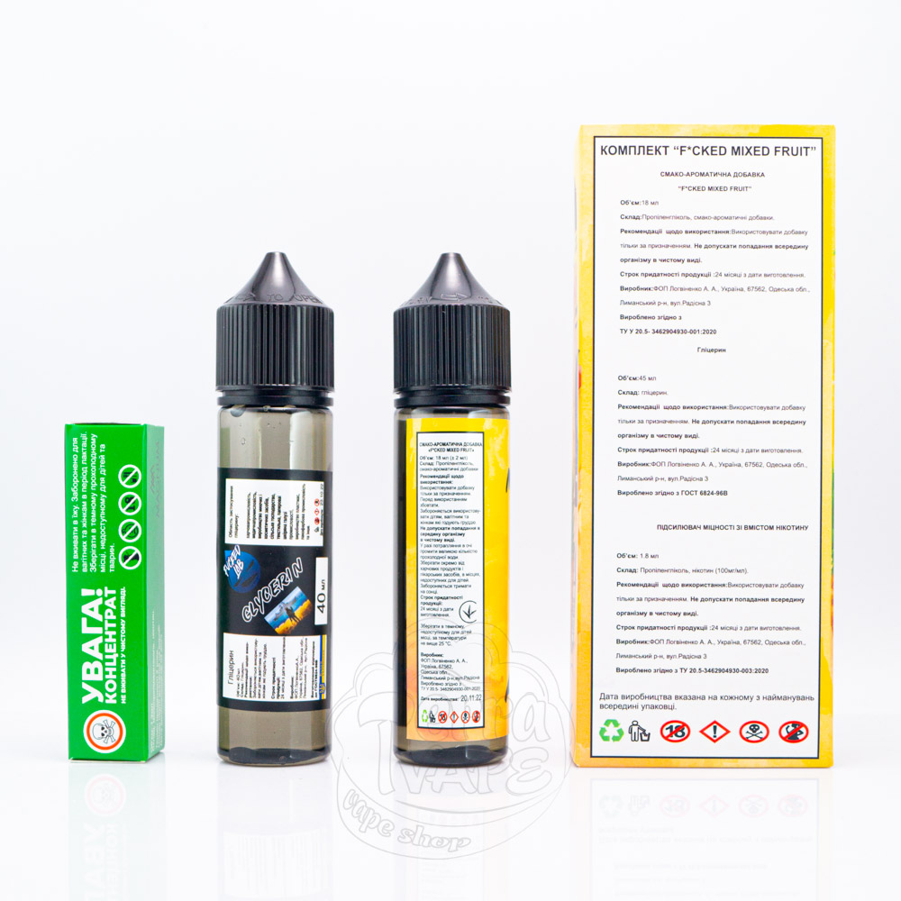 Fucked Organic - це набір для самостійного приготування органічної рідини для електронних сигарет від популярного українського виробника. Випускається в об'ємі 60 мл з впізнаваним дизайном етикетки, на якій зображені емоційні фрукти або ягоди. Міцність може бути: