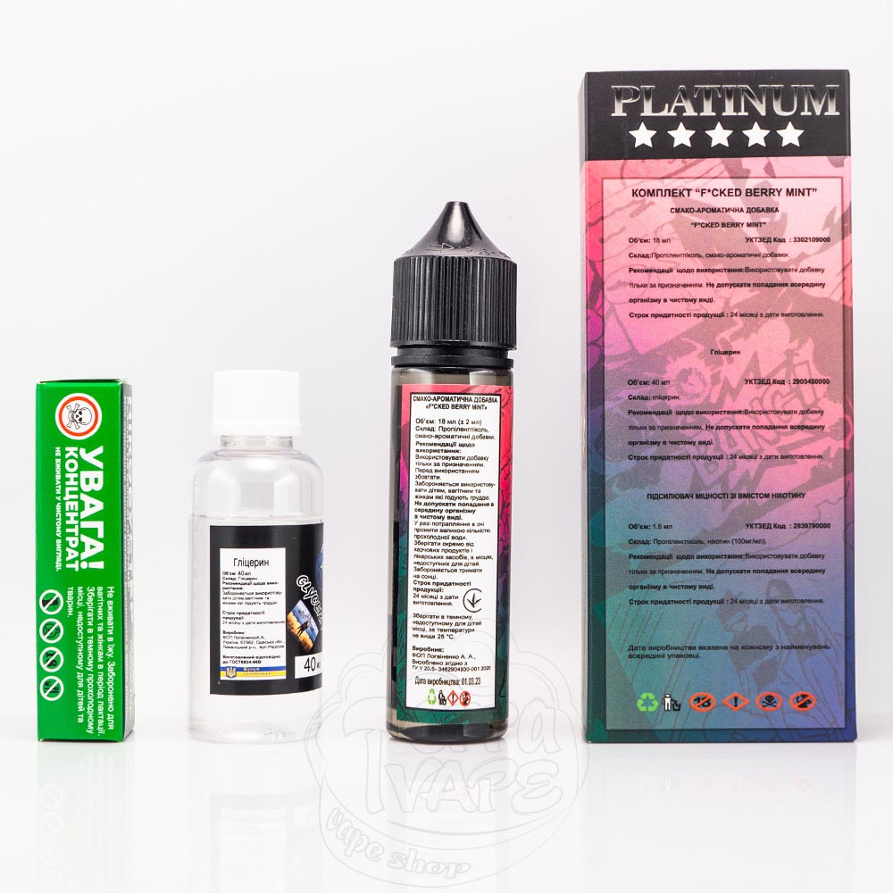 Fucked Platinum Organic - це набір для приготування органічної рідини для електронних сигарет українського виробництва. Випускається в об'ємі 60 мл, на етикетці якій фантастичні персонажі, що відображають суть смаку. Градація міцності: