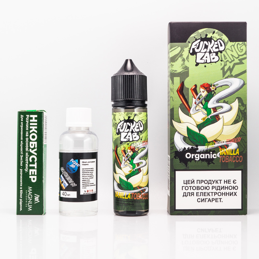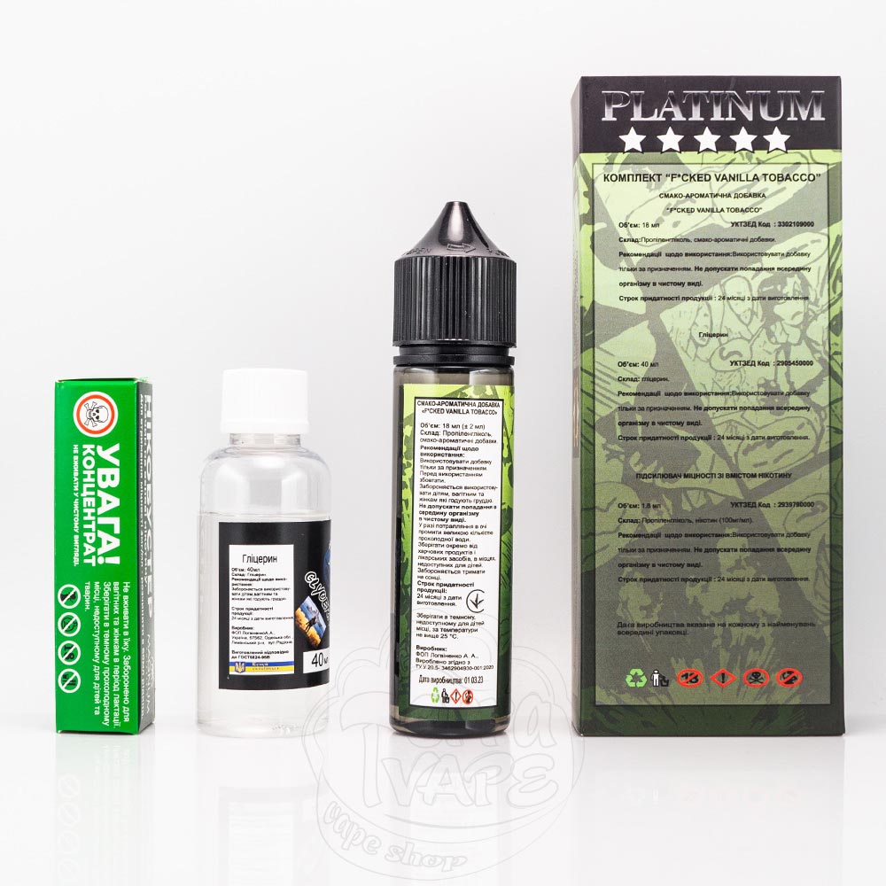 Fucked Platinum Organic - це набір для приготування органічної рідини для електронних сигарет українського виробництва. Випускається в об'ємі 60 мл, на етикетці якій фантастичні персонажі, що відображають суть смаку. Градація міцності: