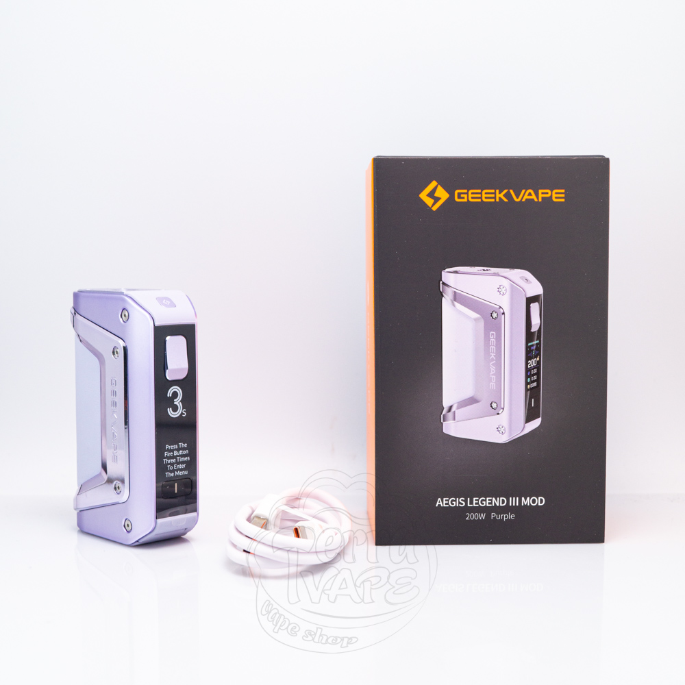Geekvape Aegis Legend 3 Box Mod 200W Silver - це третя версія легендарного бокс-мода Aegis L200, сріблястого кольору від компанії Geekvape. Пристрій працює від двох акумуляторів формату 18650 (які необхідно купляти окремо). Він все ще видає потужність до 200Вт, проте також має деякі покращення. Legend 3 використовує новітній чіпсет AS Chip 4.0, а також має функцію автоматичного блокування та розблокування від доторку. Яскравий TFT-дисплей 0.96`` допоможе вам виконувати необхідні налаштування. Посадковий майданчик дозволяє сумісність з атомайзерами до 26мм у діаметрі. В якості додаткового способу зарядки можна використовувати порт Туре-С.
