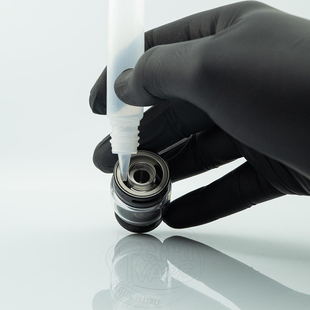 Щоб заправити атомайзер рідиною, просто відкрутіть верхню кришку, щоб дістатися двох великих отворів на баку. У ці великі отвори легко поміститься більшість флаконів для жижі.