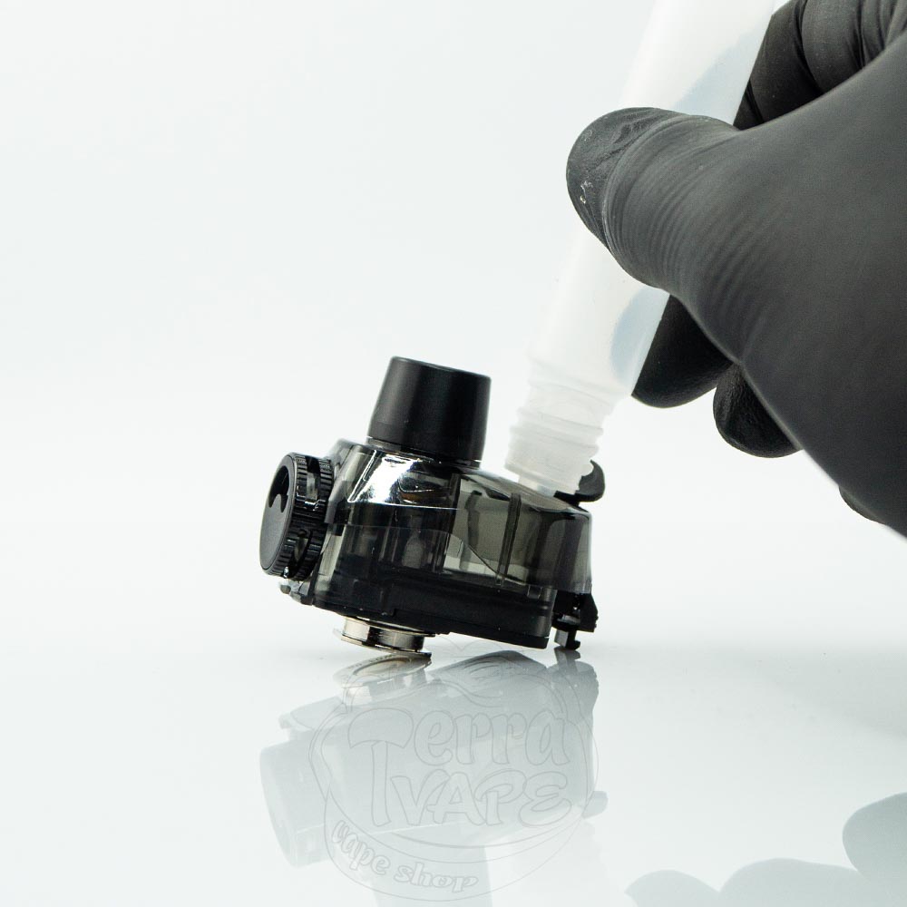 Картридж вмещает до 6 мл жидкости, работает на испарителях и имеет возможность регулировки тугости затяжки с помощью небольшого колесика на боковой части.
