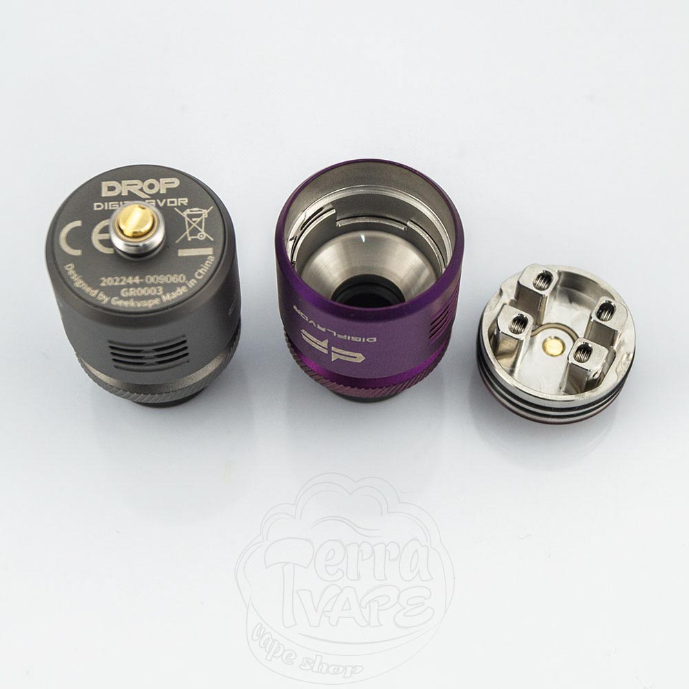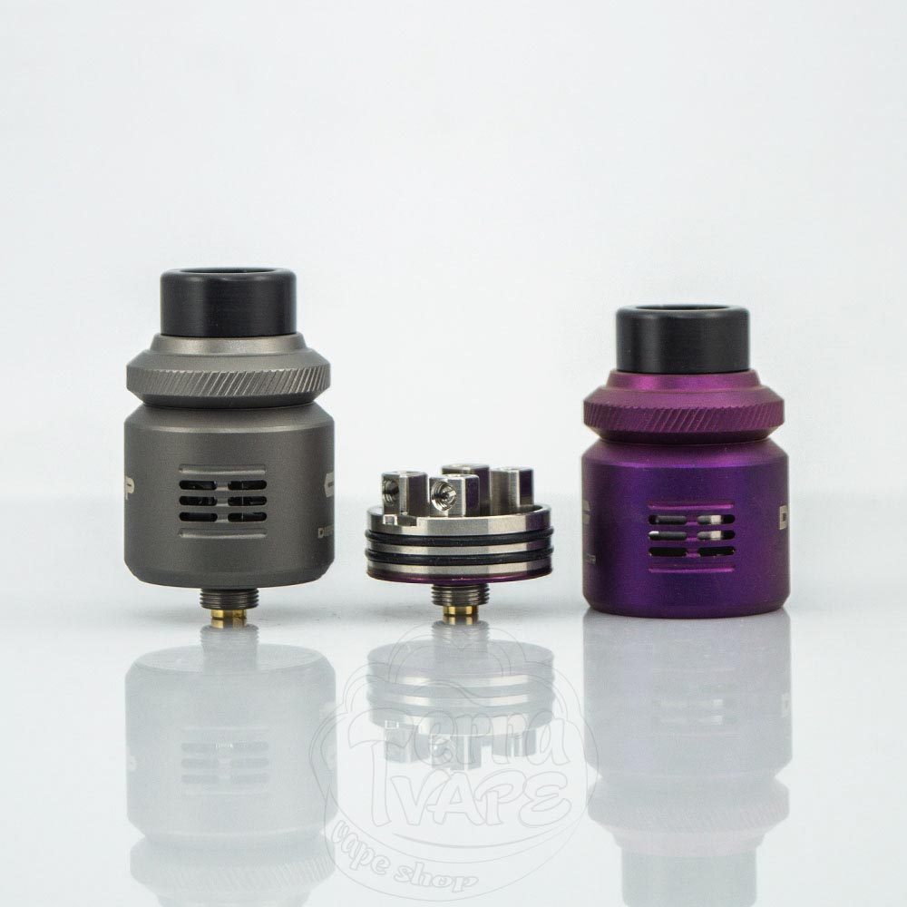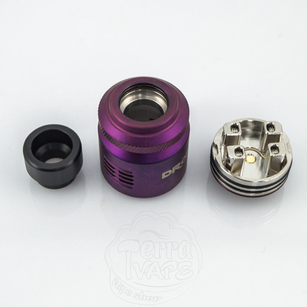 Сами атомайзеры доступны к заказу в шести цветах: черный, серый, фиолетовый, синий, серебристый и радужный. Первые три из них имеют матовое покрытие, а последние - глянцевое. Диаметр Drop v2 RDA составляет 24мм, а высота - чуть более 35мм.