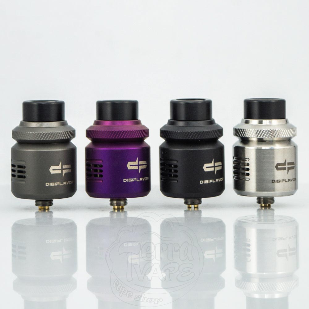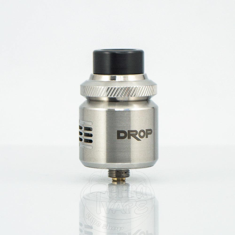 Geekvape Digiflavor Drop v2 RDA - это вторая версия дрипки на две спирали от известной компании Geekvape. Диаметр базы составляет 24мм. Корпус Drop V2 RDA полностью металлический, что означает оптимальную и эффективную проводимость спиралей. Недавно разработанное кольцо с накаткой делает контроль забора воздуха проще и точнее. Спирали устанавливаются на четыре стойки с отверстиями, а чтобы не расстраивать любителей сквонков, в комплект поставки производитель кладет BF пин. Дрипка несложная в обслуживании, поэтому подойдет как для новичков, так и для опытных вейперов.