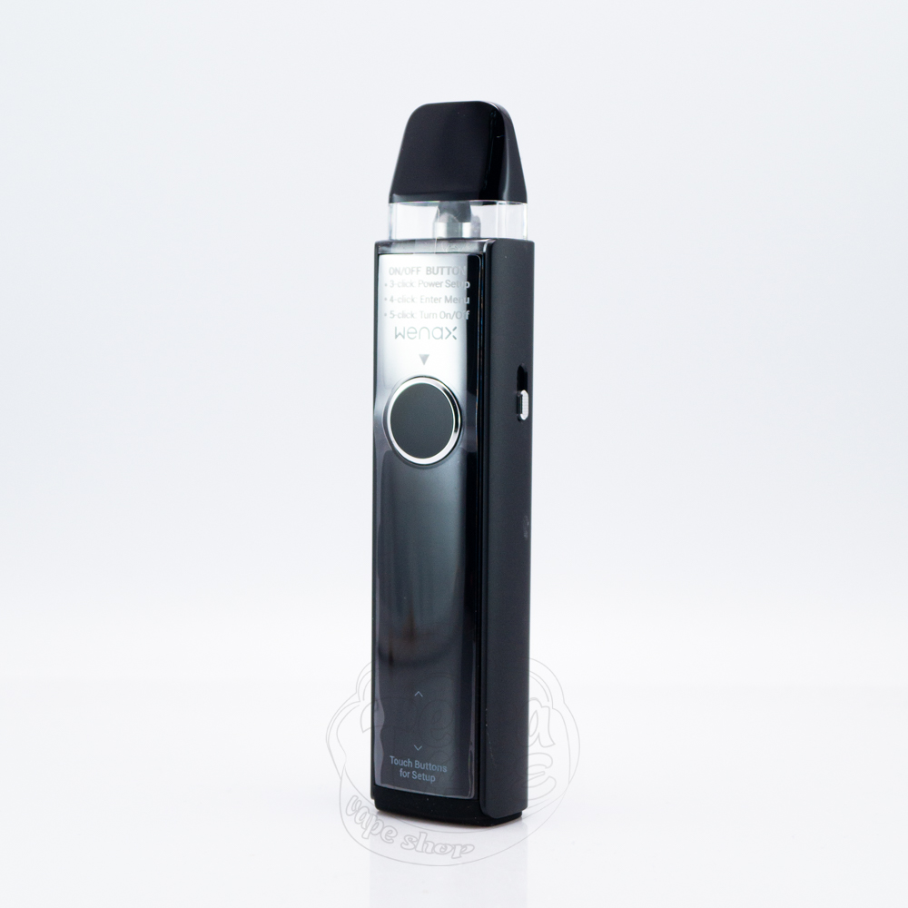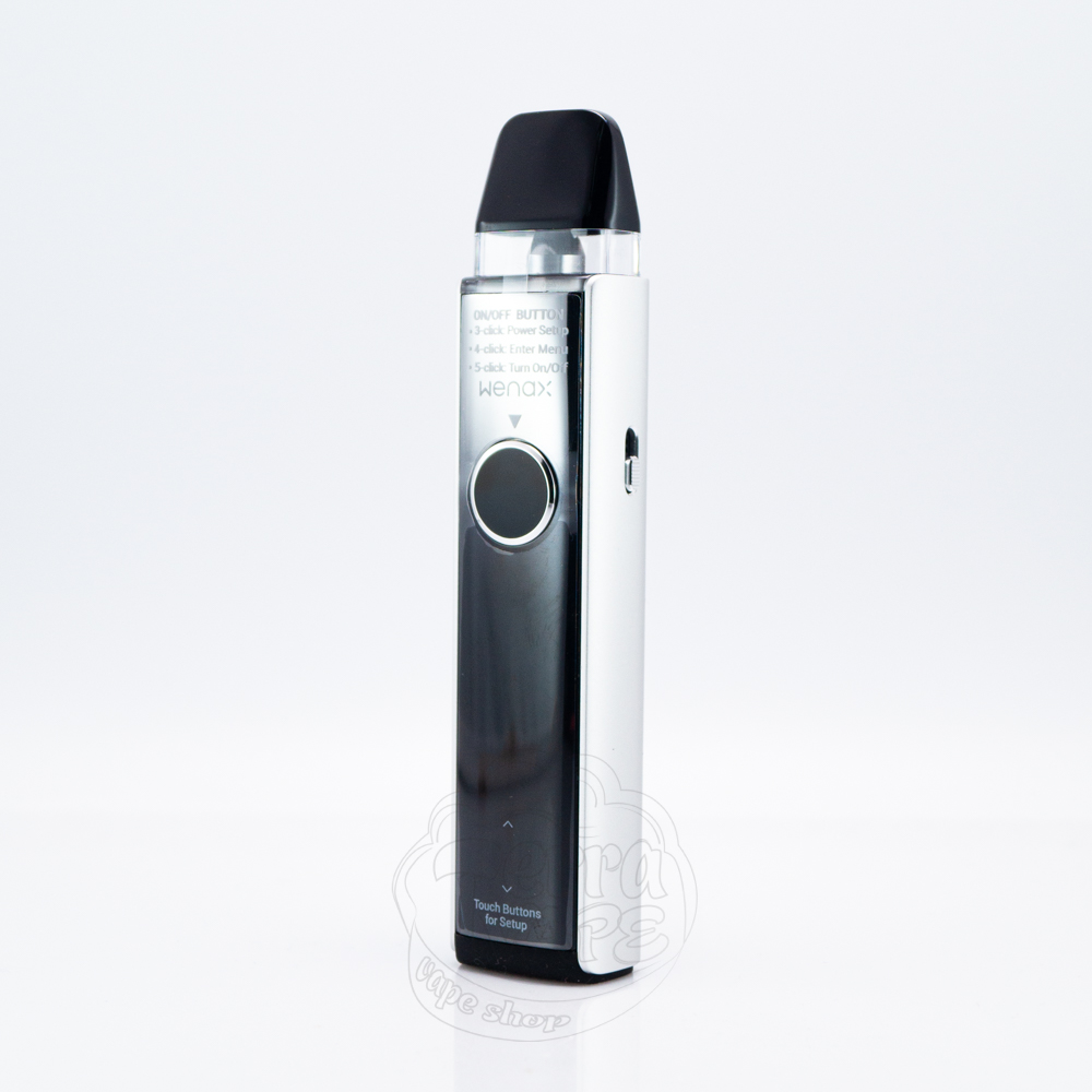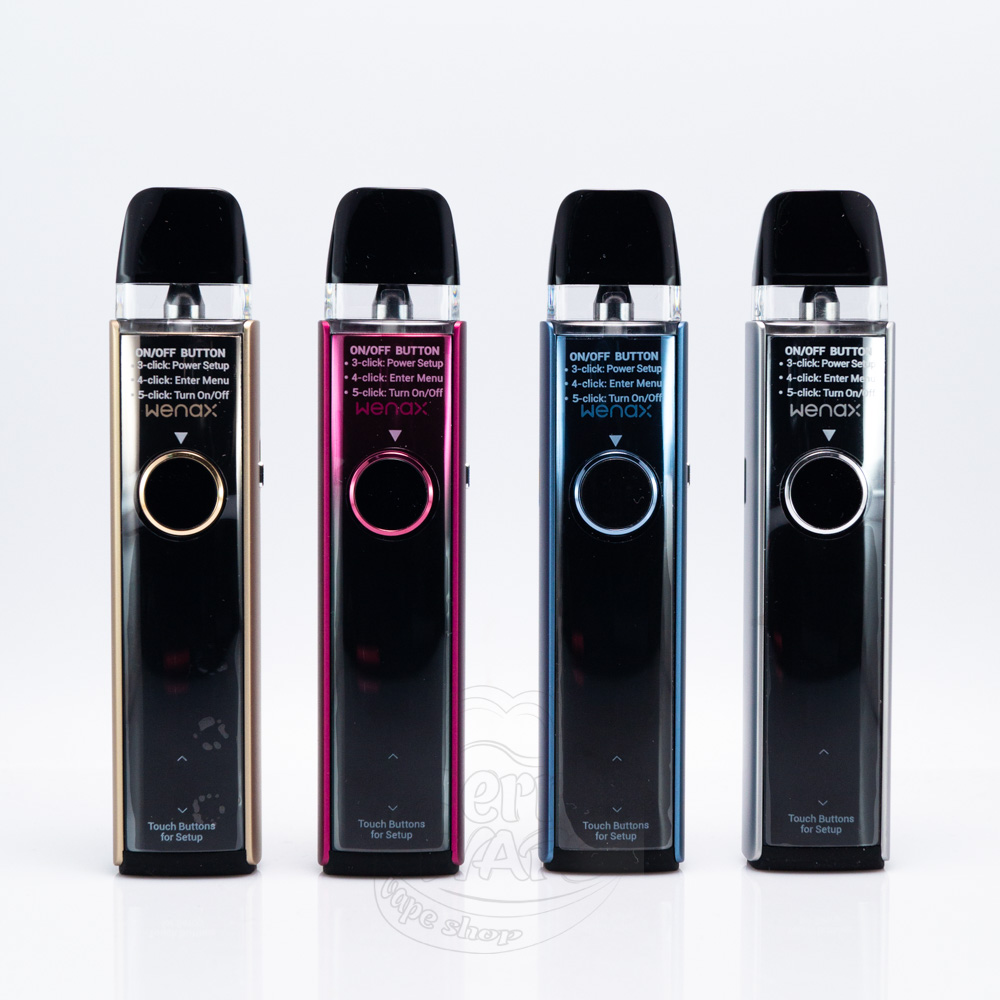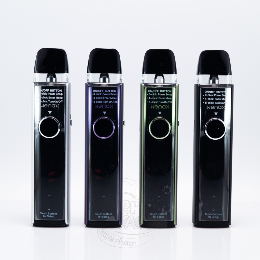 Однією з особливостей под-системи є прихований дисплей. Це 0.96-дюймовий TFT-екран, який показується тільки після того, як ви увімкнете електронну сигарету. Більш того, разом із ним з'являються сенсорні кнопки навігації, які дозволяють керувати вейпом. У нижній частині девайсу знаходиться доволі щільна гумова підкладка, яка забезпечує більш міцне зчеплення з поверхнею, а також виконує захисну функцію. На фронтальній стороні пристрою можна побачити маркування "Wenax", кнопку активації, а також там знаходиться той самий прихований екран. З одного боку розміщений регулятор тугості тяги, з іншого - зарядний роз'єм Туре-С.