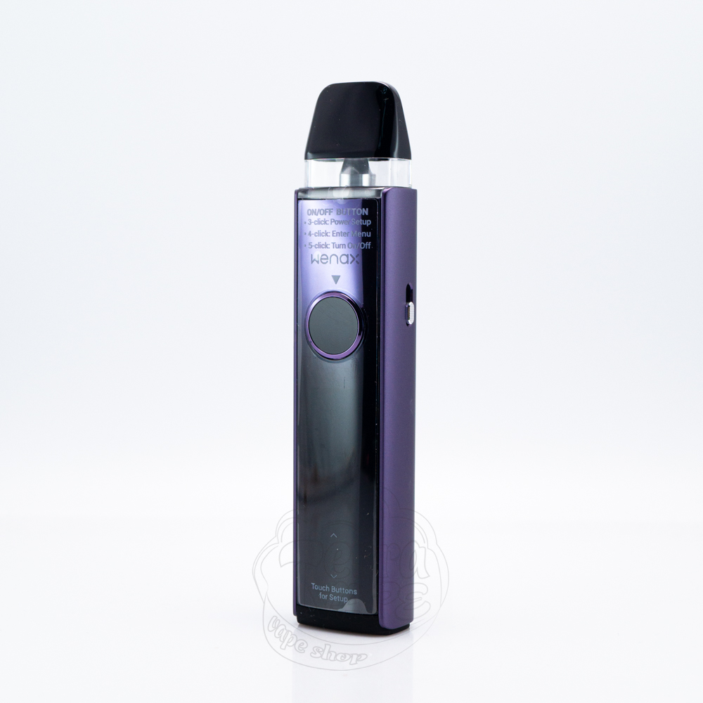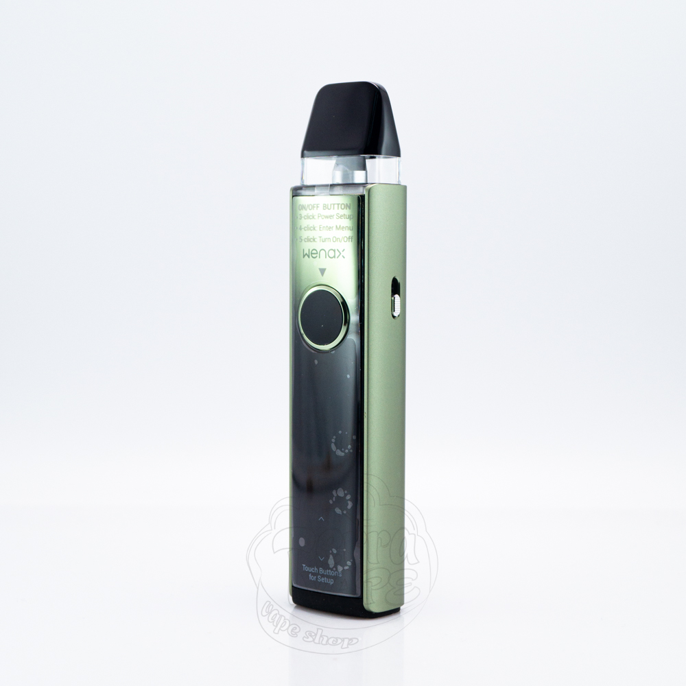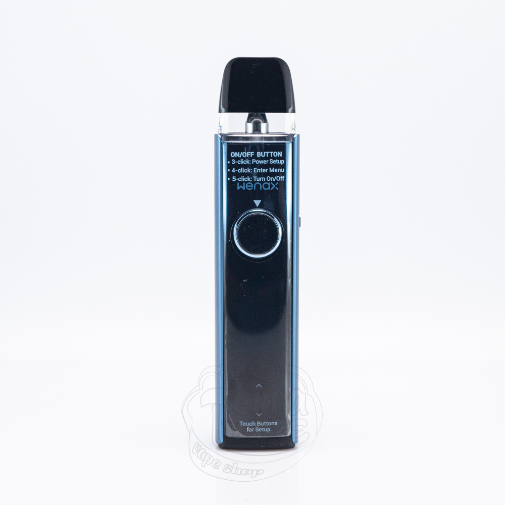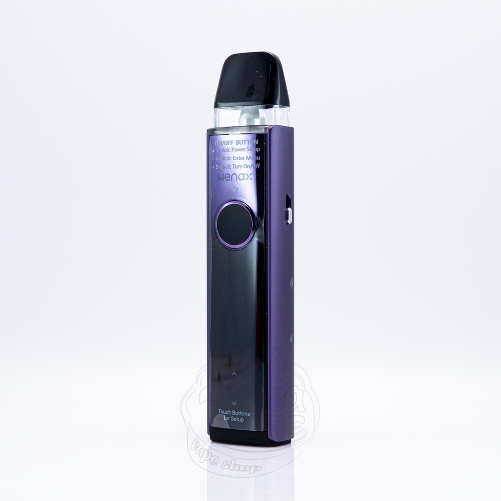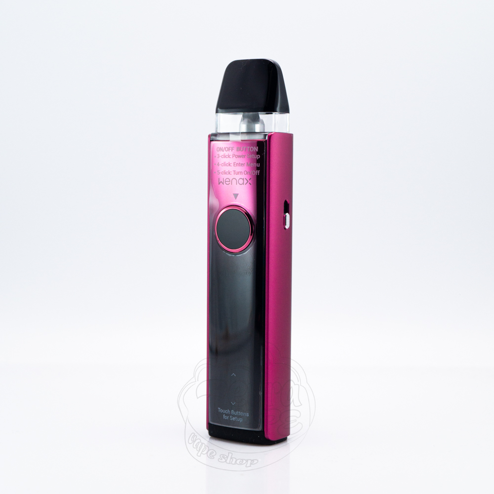 Однією з особливостей под-системи є прихований дисплей. Це 0.96-дюймовий TFT-екран, який показується тільки після того, як ви увімкнете електронну сигарету. Більш того, разом із ним з'являються сенсорні кнопки навігації, які дозволяють керувати вейпом. У нижній частині девайсу знаходиться доволі щільна гумова підкладка, яка забезпечує більш міцне зчеплення з поверхнею, а також виконує захисну функцію. На фронтальній стороні пристрою можна побачити маркування "Wenax", кнопку активації, а також там знаходиться той самий прихований екран. З одного боку розміщений регулятор тугості тяги, з іншого - зарядний роз'єм Туре-С.