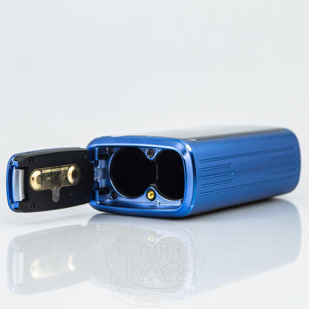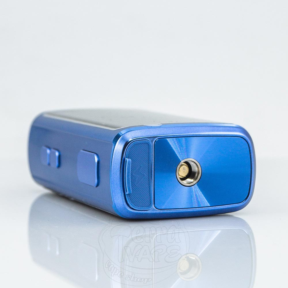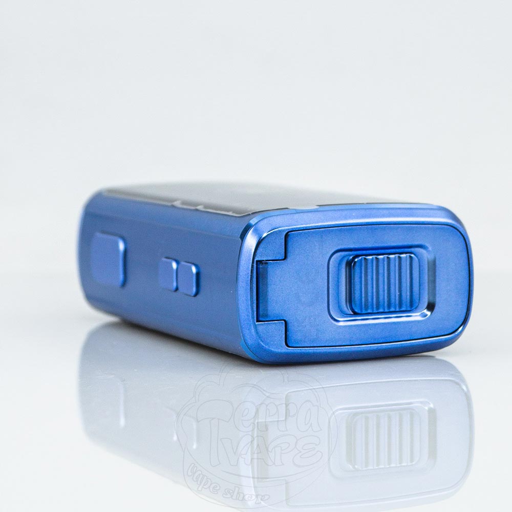 У верхній частині є коннектор 510 формату. Він розташований прямо посередині, тому при встановленні баки будуть сидіти по центру. Поруч знаходиться порт для зарядки Micro-USB, захищений силіконовою заглушкою. На бічній стороні ви побачите велику кнопку активації і дві дві менші кнопки регулювання. Всі вони, по суті, прямокутної форми, але мають зрізані кути. Знизу розміщена підпружинена і тверда на дотик кришка батарейного відсіку. Два акумулятори щільно помістяться всередині, а позолочені контакти створюють оптимальне з'єднання.