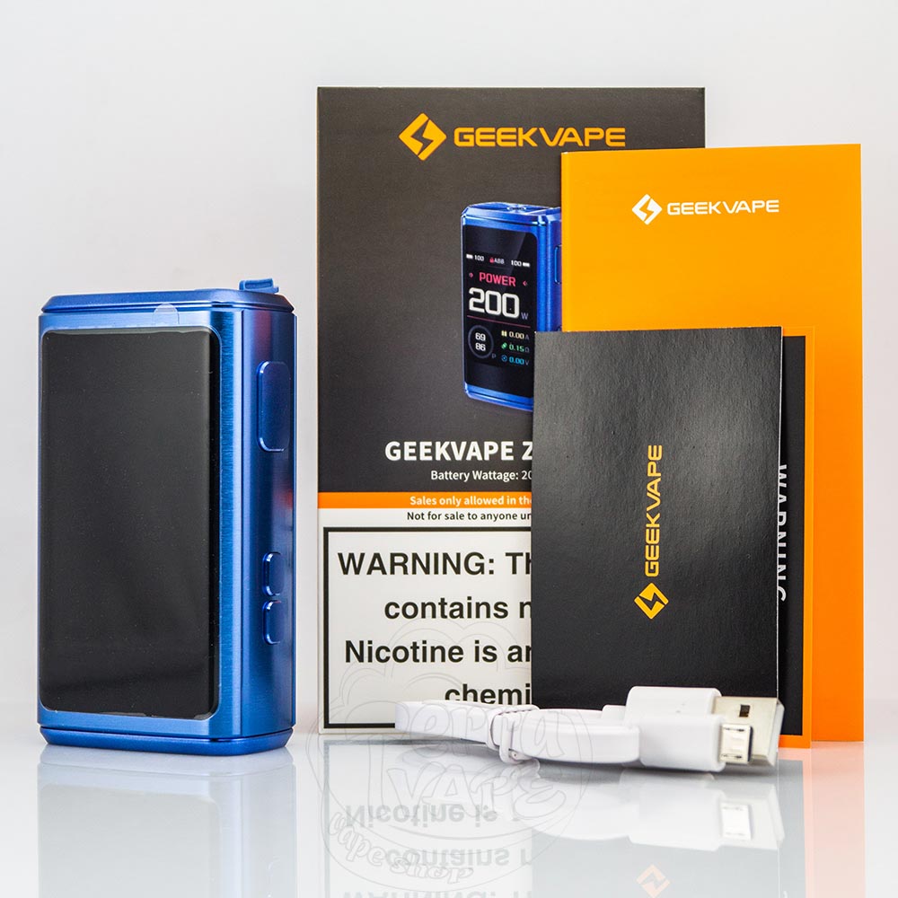 Geekvape Z200 Box Mod 200W - це один з бокс модів зет серії від виробництва відомої вейп-компанії Geekvape. Екран розміром 2.4`` та висока продуктивність роблять Z200 високотехнологічним пристроєм, який також надзвичайно простий та практичний у використанні завдяки кнопкам керування. Ви зможете комбінувати його з більшістю атомайзерів, адже посадковий майданчик складає 26мм. Для роботи електронної сигарети необідні два акумулятори формату 18650. Зверніть увагу, що в комплекті вони не постачаються. Максимальна потужність, яку здатен видати Z200 становить 200W. Щоб підзарядити девайс, використовуйте кабель Micro USB.
