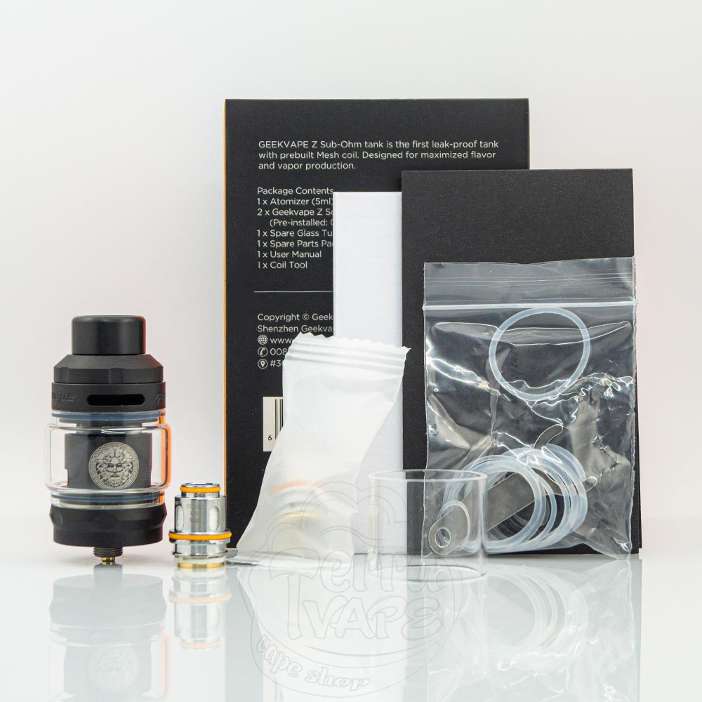 GeekVape Zeus Z Sub Ohm Tank Atomizer Black – это необслуживаемый бак черного цвета, на испарителях от компании GeekVape. Диаметр базы составляет 26мм, а объем – 5мл. Отлично подойдет для тех, кто хочет больших облака пара и не заморачиваться с обслуживанием.