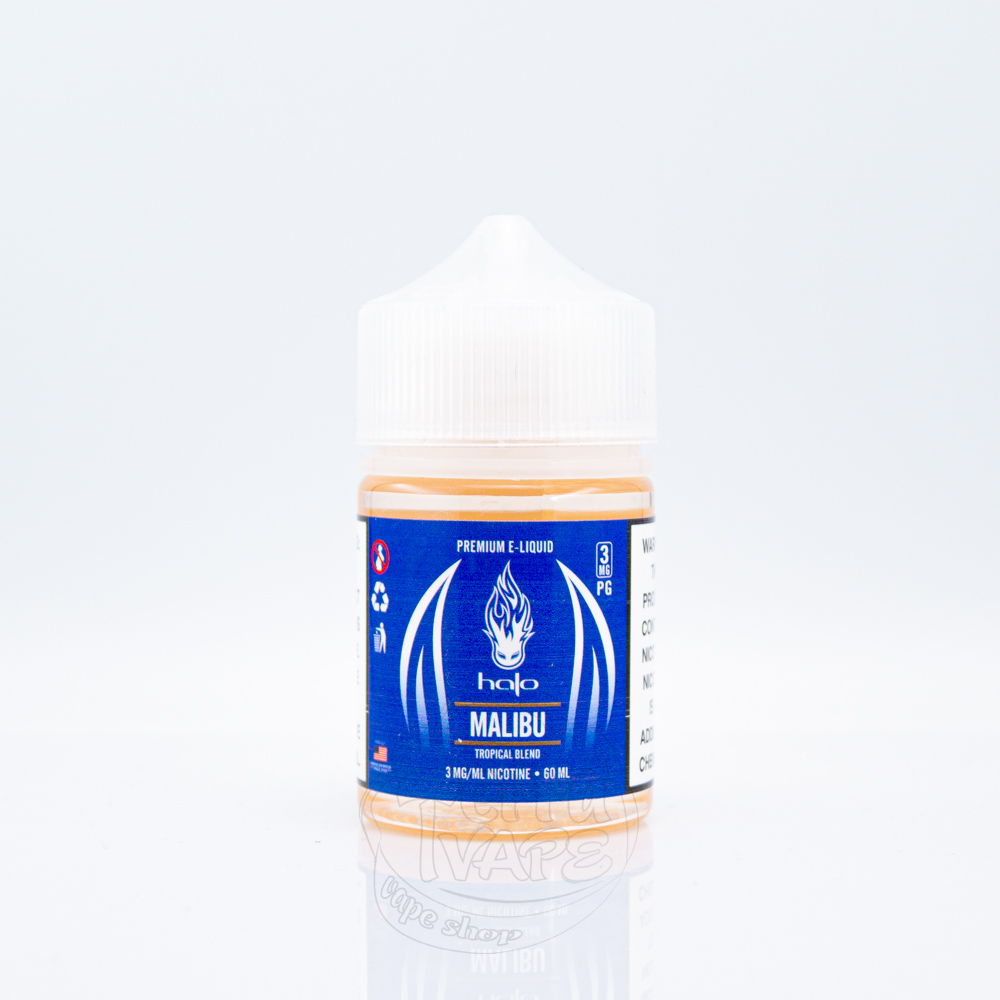 Halo Organic Malibu 60ml 6mg - це жижка для електронних сигарет на органічному нікотині, яка має приємний м'який смак коктейлю піна колада з додаванням запашної м'яти, який ідеально підходить для паріння біля басейну або на пляжі.