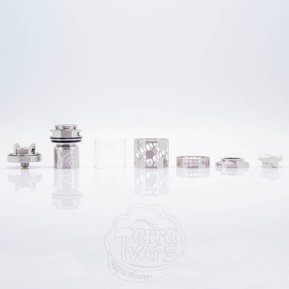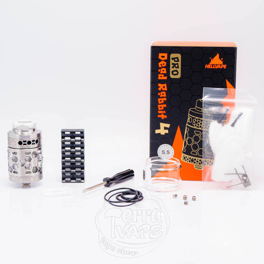 Hellvape Dead Rabbit 4 RTA Pro Tank Atomizer - це про-версія четвертого обслуговуваного баку Dead Rabbit від відомої в світі вейпінгу компанії Hellvape. Заправка верхня, об'єм резервуару становить 3.5мл, а з бабл склом - 5.5мл. База тут діаметром 26мм, а простора дека передбачає установку 2 спіралей. Обдув верхній та регулюється за допомогою обертання кільця обдуву. 810 дріп-тип знімний з можливістю заміни.