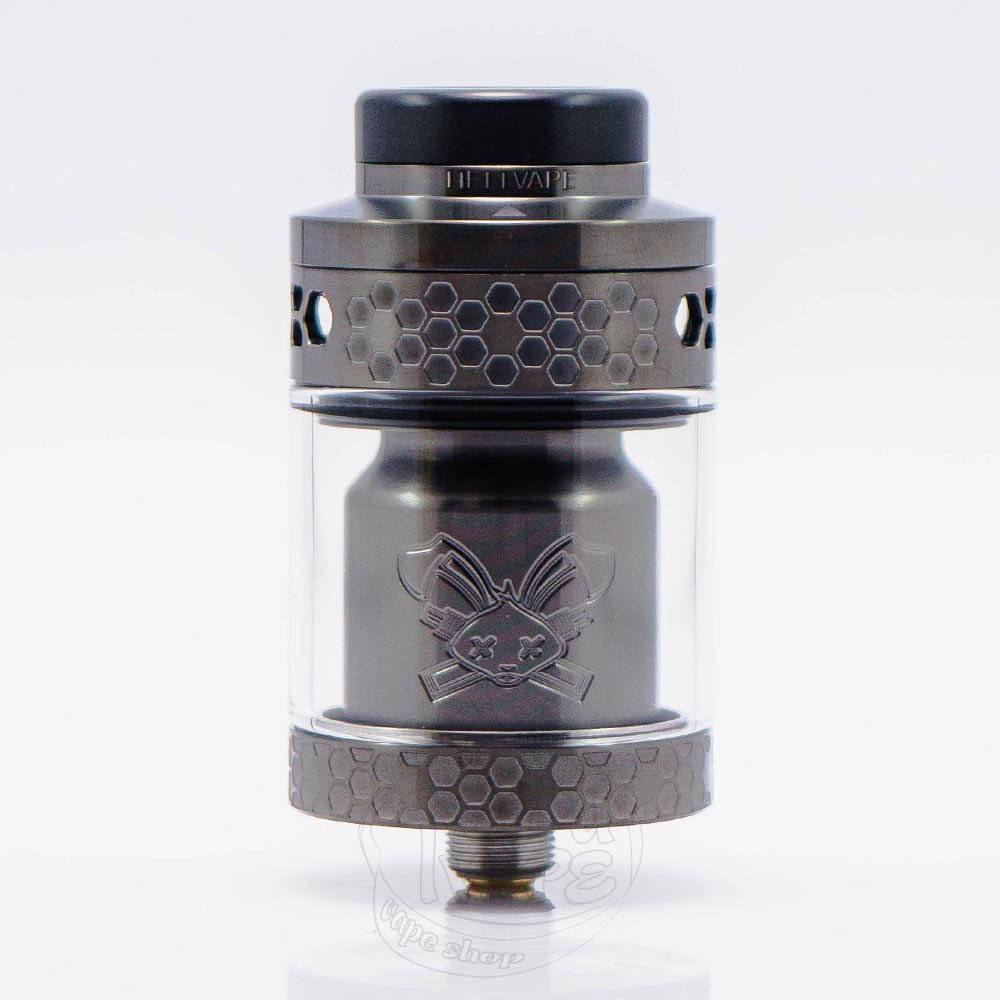 Hellvape Dead Rabbit 4 RTA Tank Atomizer Gunmetal - це четверта версія Dead Rabbit RTA сірого кольору від популярного та надійного виробника Hellvape. Діаметр бази становить 26мм. Об'єм 3.5мл, а з бабл-склом - 5.5мл. Безстоєчна дека, ширина якої становить 13мм, розрахована на установку двох спіралей. Обдув верхній та регулюється завдяки рухомому кільцю. Отвір для заправки знаходиться зверху, а побачити його можна, здвинувши топ-кеп у напрямку стілки, що зображено біля 810 дріп-типу.