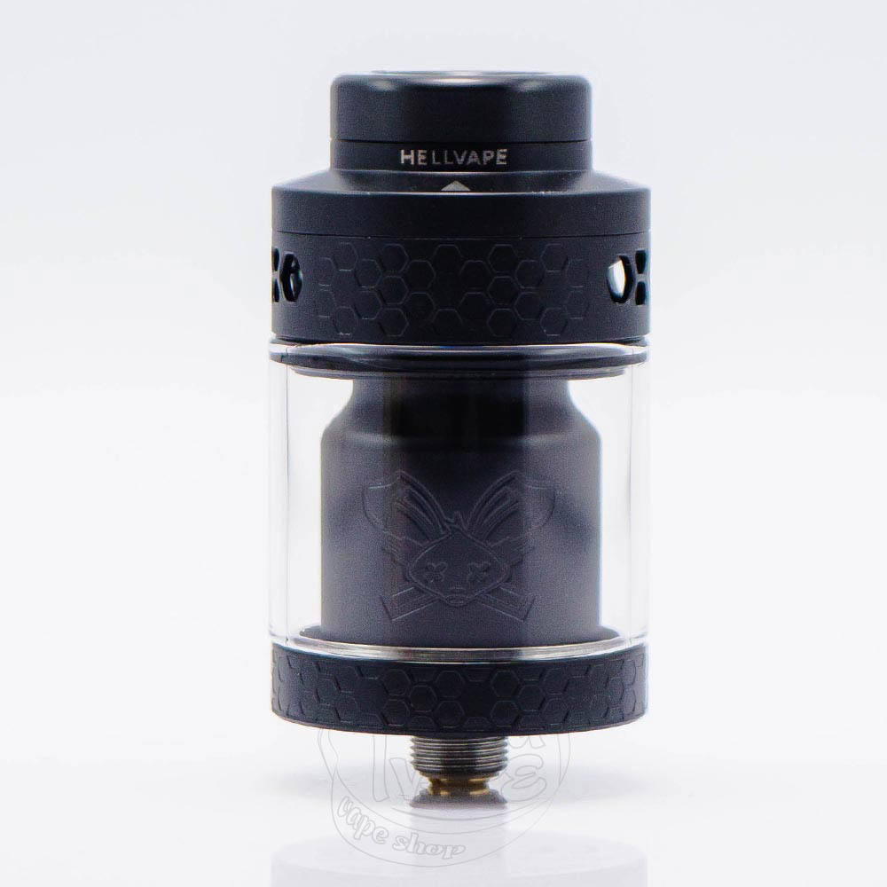 Hellvape Dead Rabbit 4 RTA Tank Atomizer Matte Full Black - це четверта версія Dead Rabbit RTA матового чорного кольору від популярного та надійного виробника Hellvape. Діаметр бази становить 26мм. Об'єм 3.5мл, а з бабл-склом - 5.5мл. Безстоєчна дека, ширина якої становить 13мм, розрахована на установку двох спіралей. Обдув верхній та регулюється завдяки рухомому кільцю. Отвір для заправки знаходиться зверху, а побачити його можна, здвинувши топ-кеп у напрямку стілки, що зображено біля 810 дріп-типу.