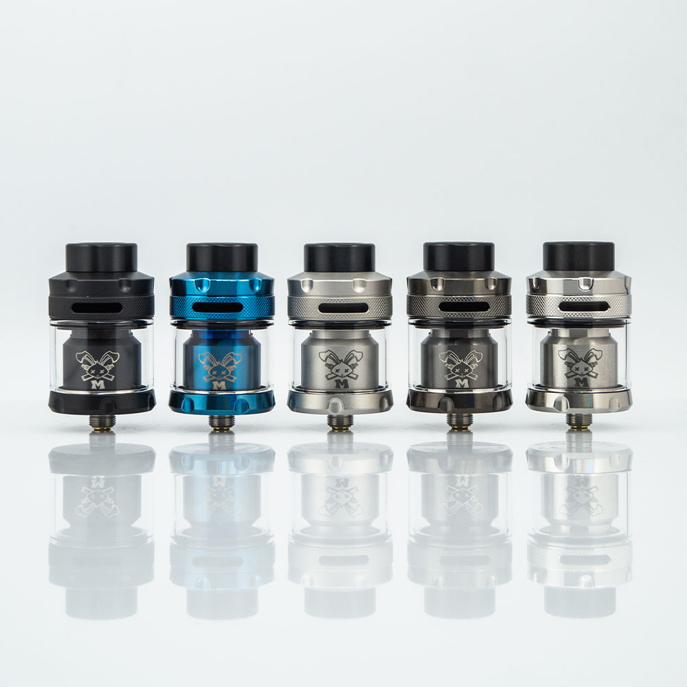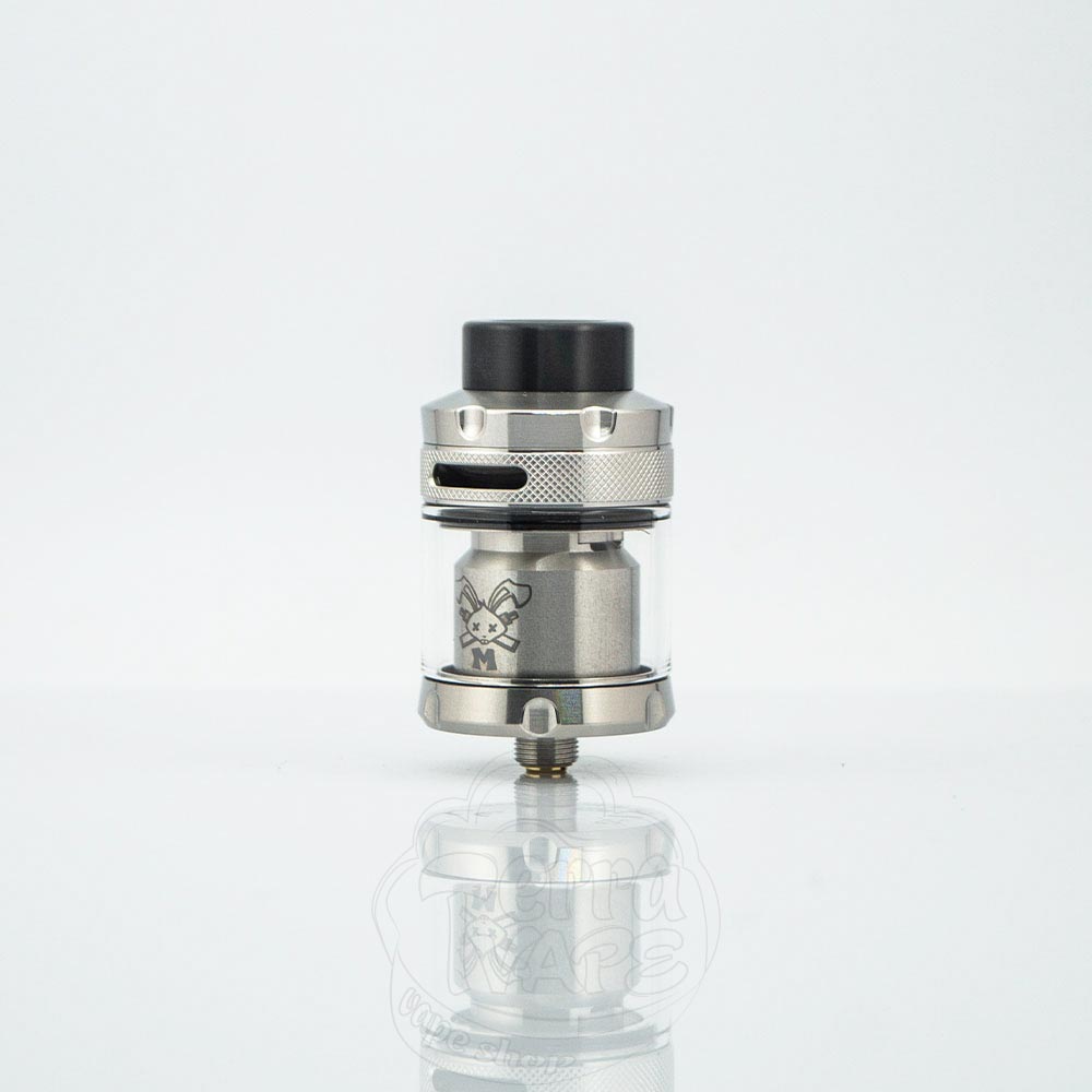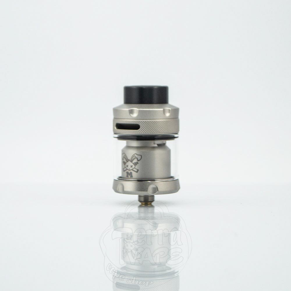 HellVape Dead Rabbit M RTA – це бак, що обслуговується на сітці від компанії HellVape. Діаметр основи – 25мм. Об'єм може бути 3мл або 4.5мл залежно від того, використовується пряме або бабл-скло відповідно. Заправляється зверху шляхом відкручування кришки. Забір повітря також відбувається у верхній частині. Позиціонується як бак-непроливайка.