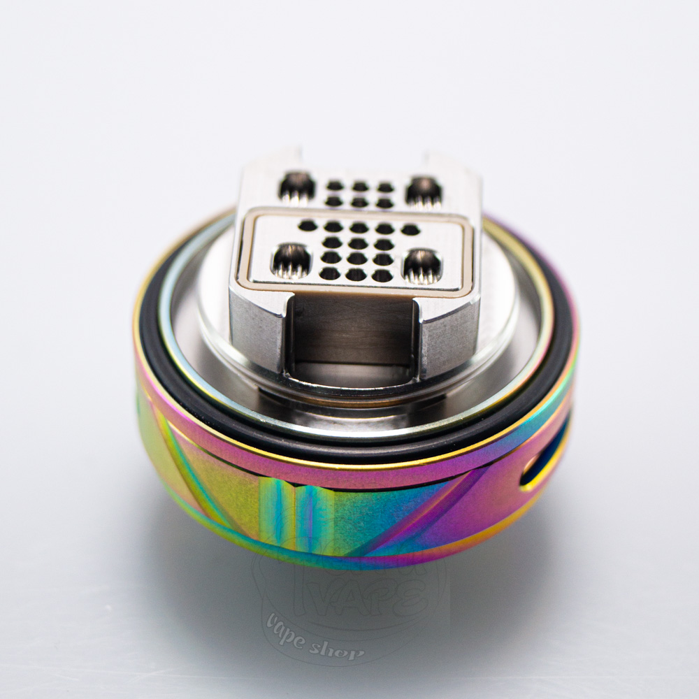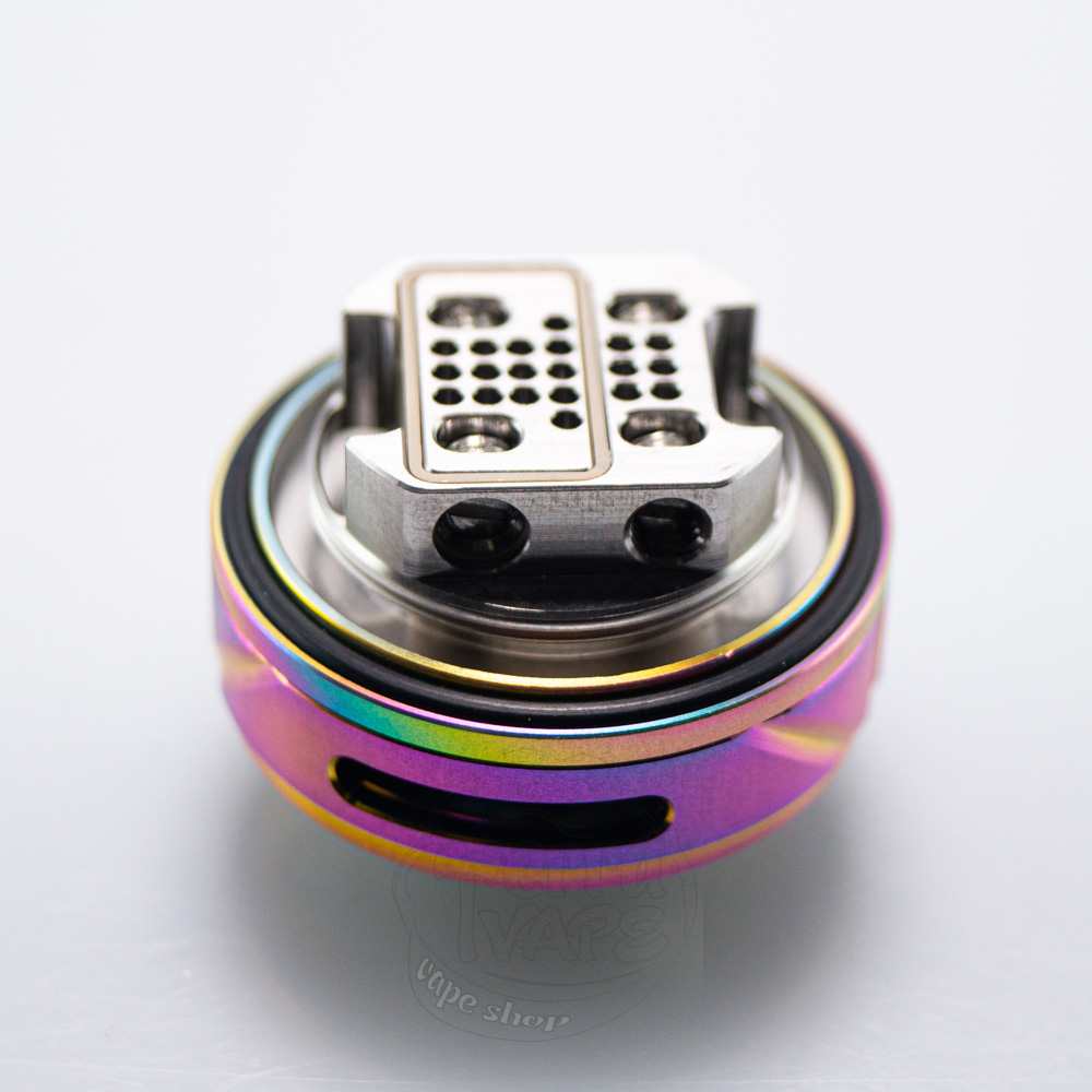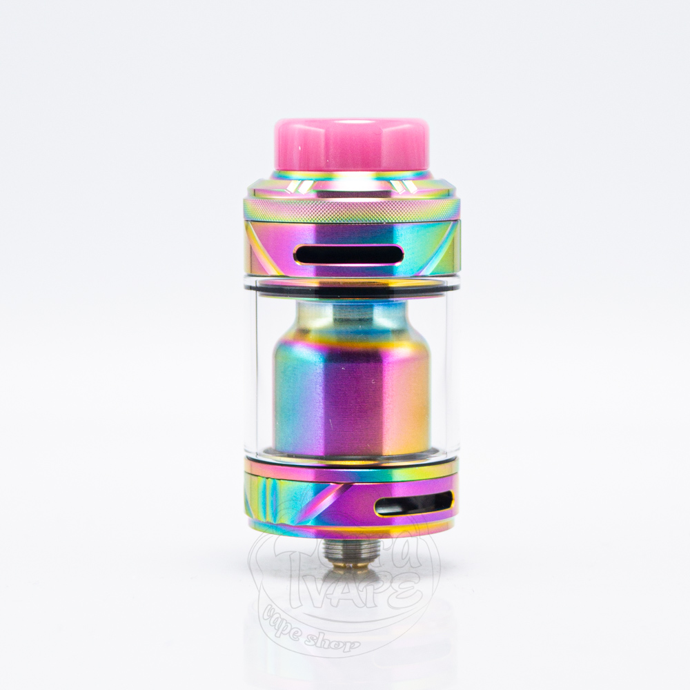 Зверху та знизу розташовано два доволі широких кільця обдуву. На кожному з них є по декілька діагональних вирізів, які розбавляють дизайн і додають йому акцентів. Отвори обдуву суцільні, вони доволі вузькі та довгі. На верхній кришці можна побачити насічки, а також тонку смужку з накаткою. Вгорі розміщується 810 дріп-тип з гарними акриловими візерунками.