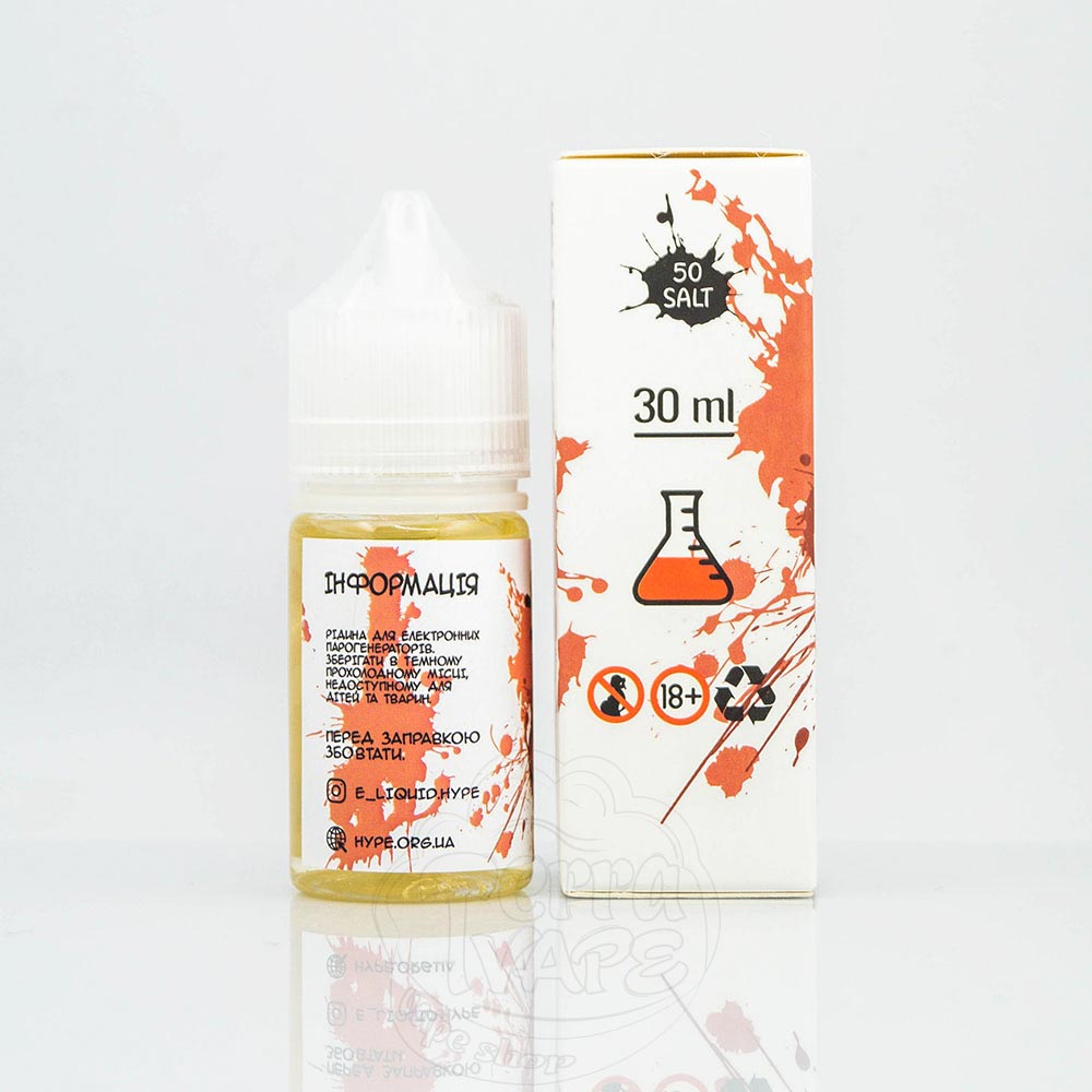 Рідина Хайп Салт випускається у пластикових флаконах об'ємом 30мл. Співвідношення гліцерину до пропілену гліколю VG/PG - 50/50 , таким чином вона відмінно підійде для багаторазових pod систем або pod mod на середній потужності.