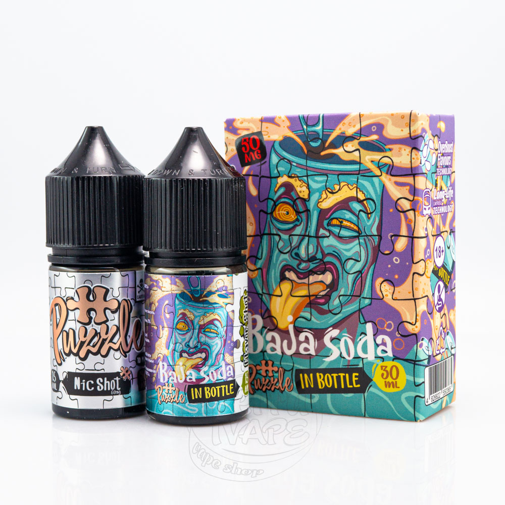 In Bottle Puzzle Salt Baja Soda 30ml 30mg - незвичайний смак газованого напою, що поєднує в собі цитруси, кокос, аніс і кардамон з легким вершковим присмаком.