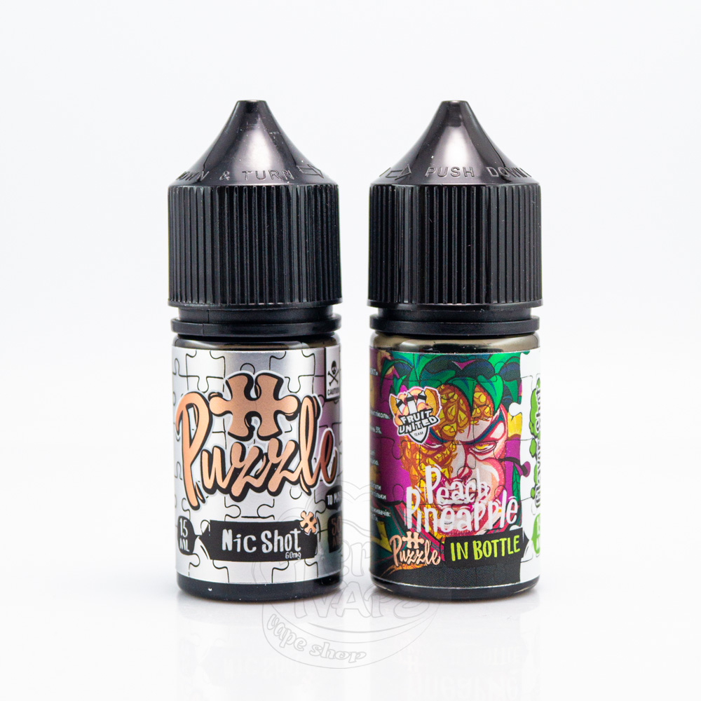 In Bottle Puzzle Salt 30ml - це набір для самостійного приготування сольової рідини малайзійського виробництва для використання з багаторазовими pod системами або іншими малопотужними електронними сигаретами. Поставляється в стильних картонних коробочках, всередині яких розташувалися флакони об'ємом 30 мл. Дизайн має впізнаваний стиль із зображенням фруктів, наче б вони були людьми.