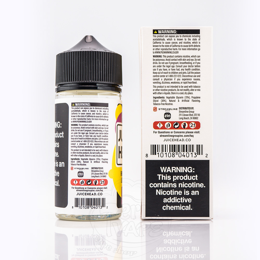Juice Head Organic 100ml - це американська рідина для електронних сигарет на нікотині органічного походження. Продається у пластиковому флаконі 100мл з системою контролю першого відкриття. Етикетка має абстрактний дизайн з двома акцентними кольорами, які наштовхують на думку про смак, що знаходиться всередині.