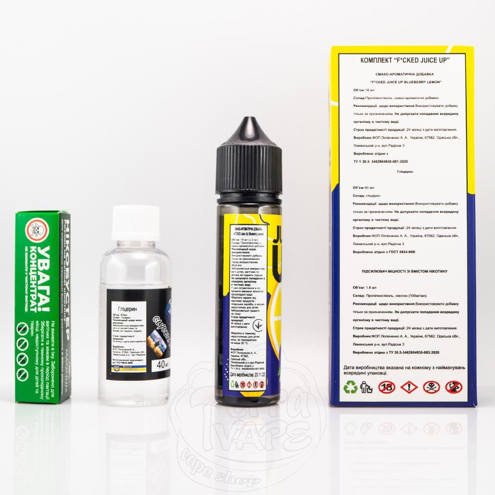 Juice Up Organic - це набір для самостійного приготування органічної рідини від популярного українського виробника Fucked Lab. Випускається в пластикових флаконах об'ємом 60 мл з етикеткою, виконаною у впізнаваному дизайні, який відображає обраний смак. Співвідношення VG/PG - 70/30, а міцність може бути в двох варіантах: