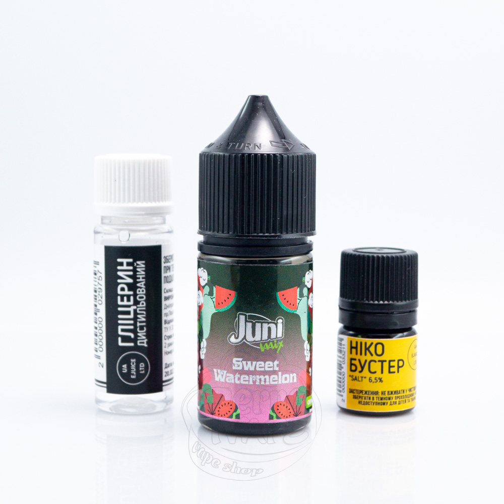 Juni Mix Salt Sweet Watermelon 30ml 65mg - це набір для самостійного приготування сольової жижі зі смаком нарізаного великими скибками солодкого кавуна, який хочеться куштувати знову і знову.